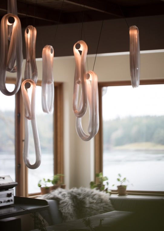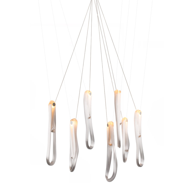 Soda water is used to trap air in a super heated glass matrix, which is vertically stretched and folded back onto itself between pegs numerous times. As the glass cools, the folding motion along the grain of the loop turns the entrapped air into microfilaments that give the piece a pearlescent optical quality. A low-voltage xenon or LED light source is introduced at one end of the loop casting light through the microfilaments and registering a gentle gradient.