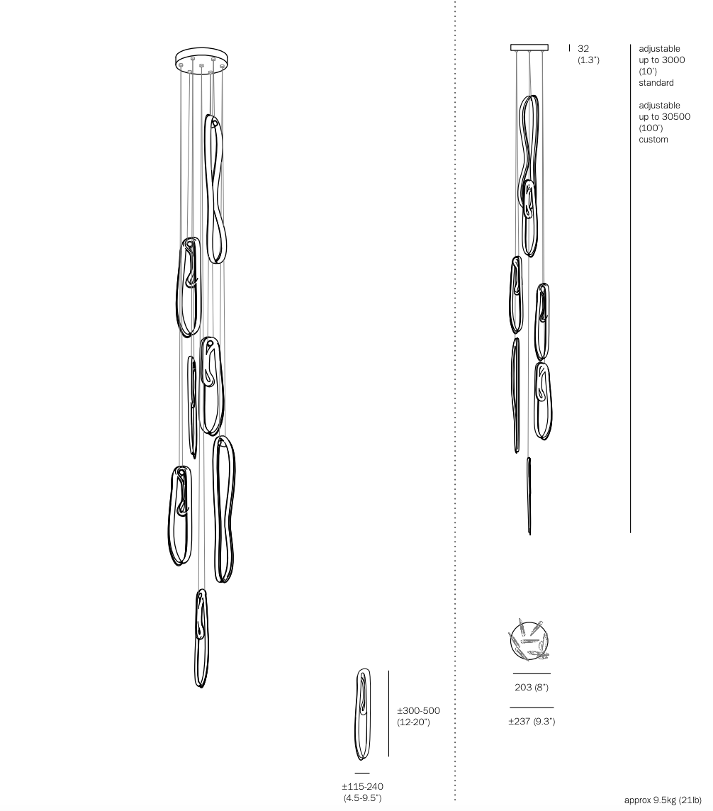 87.7 random is comprised of 7 pendants suspended from a canopy and swag hook. Pendants can be hung from any number of optional swag points mounted on or away from the canopy. Comes with 7x 10ft of coax cable and aircraft cable.