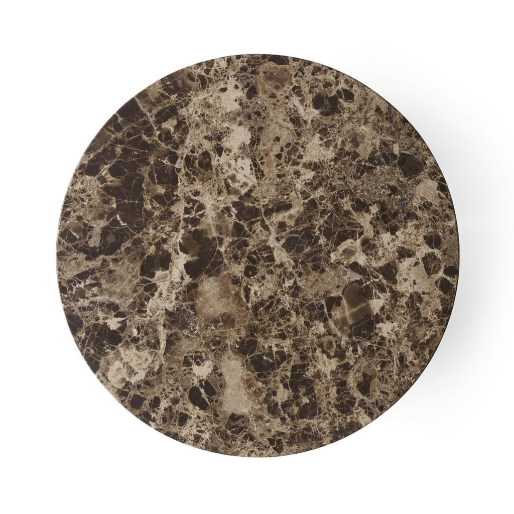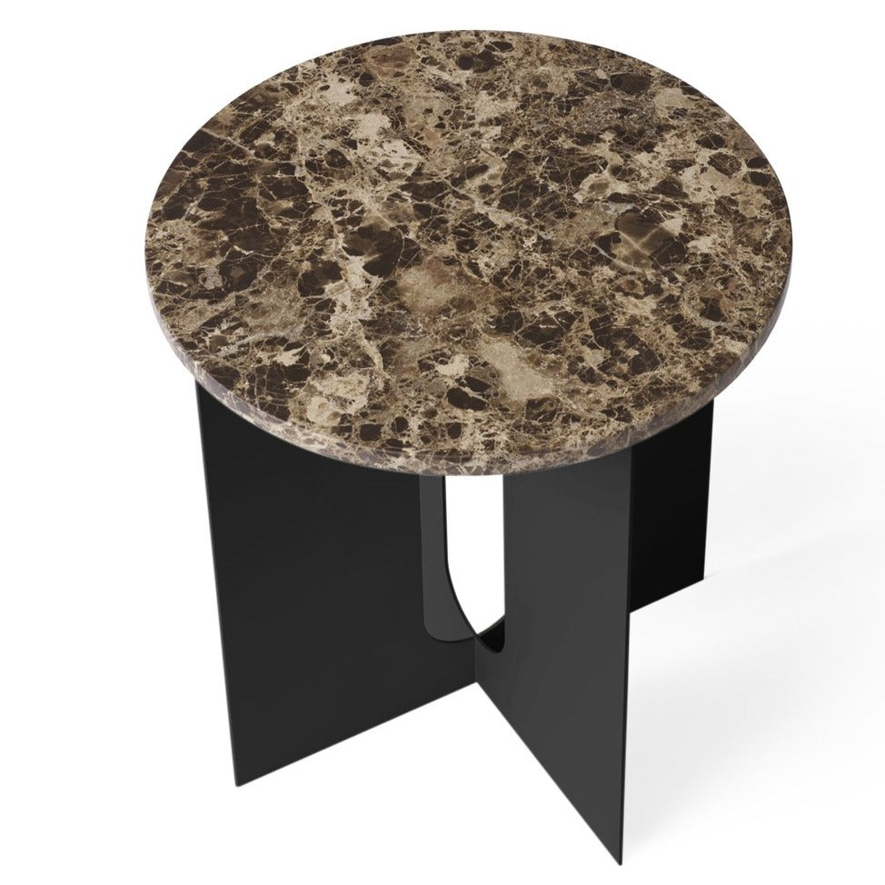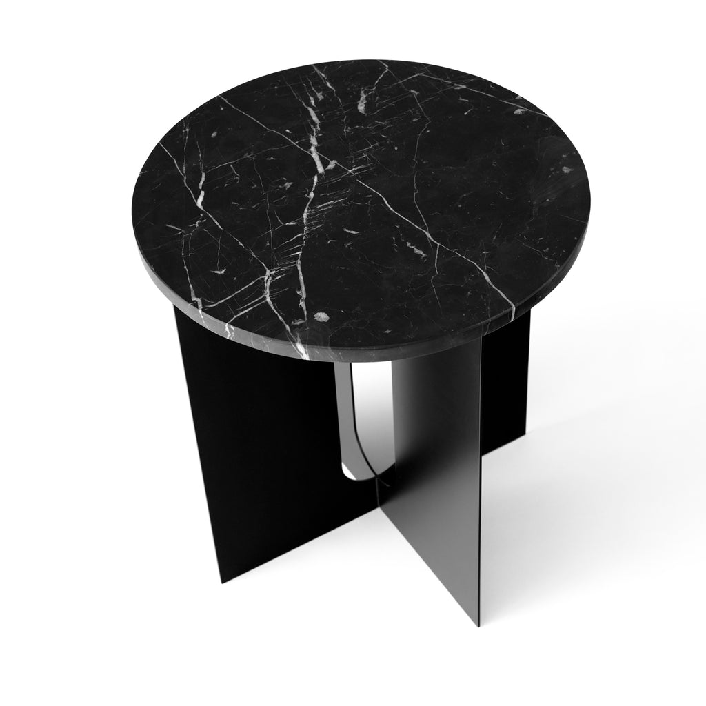 The table is useful for everything from small restaurant spaces and bedsides to exhibition spaces. The shine of the honed marble surface against the matte steel results in a versatile visual identity that is both modernist and industrial.