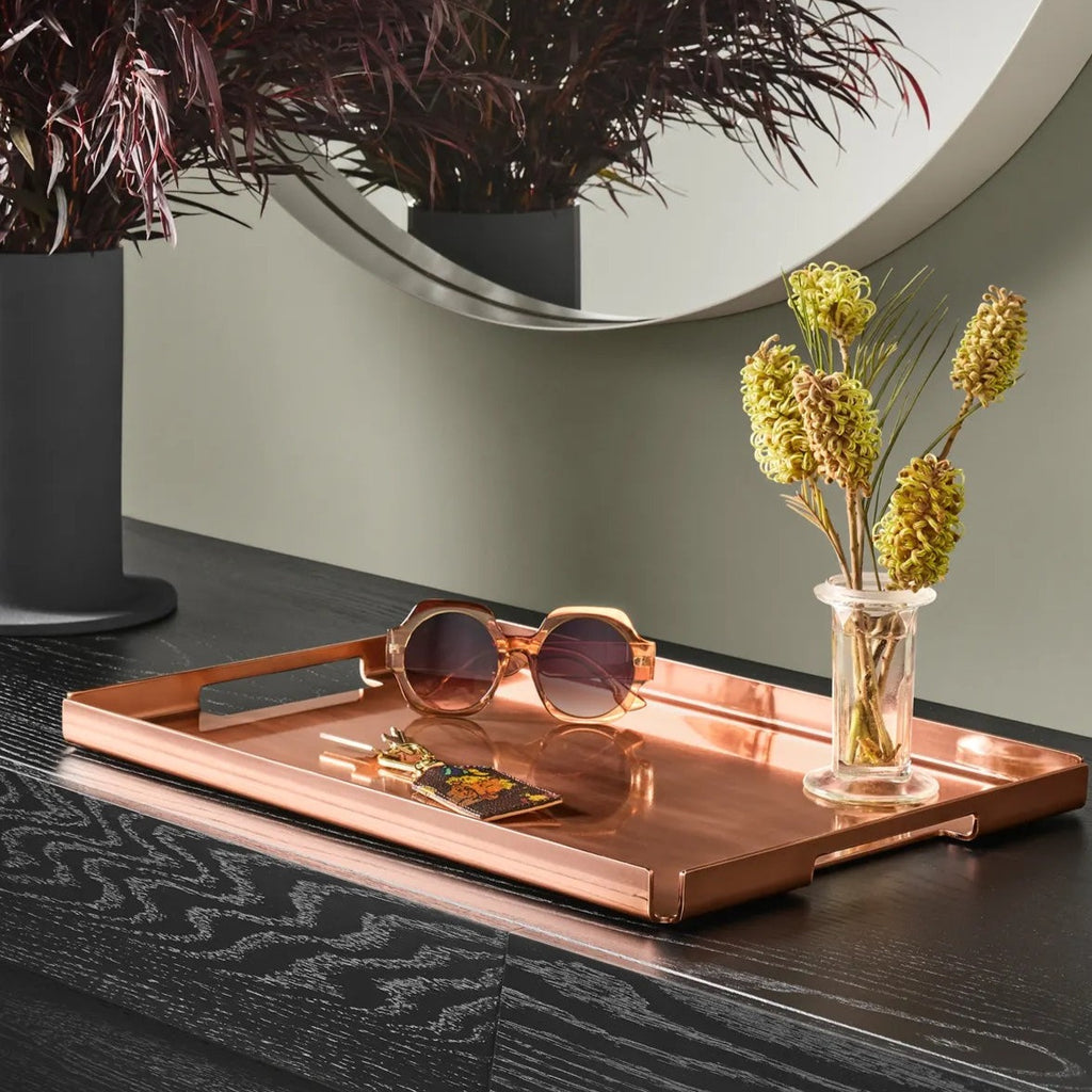 Butler not included. The Queen will see you now. Fancy steel and copper trays instantly elevate everything you put on them. Carry your crumpets, display your crown jewels or serve your finest scotch with plenty of pomp.