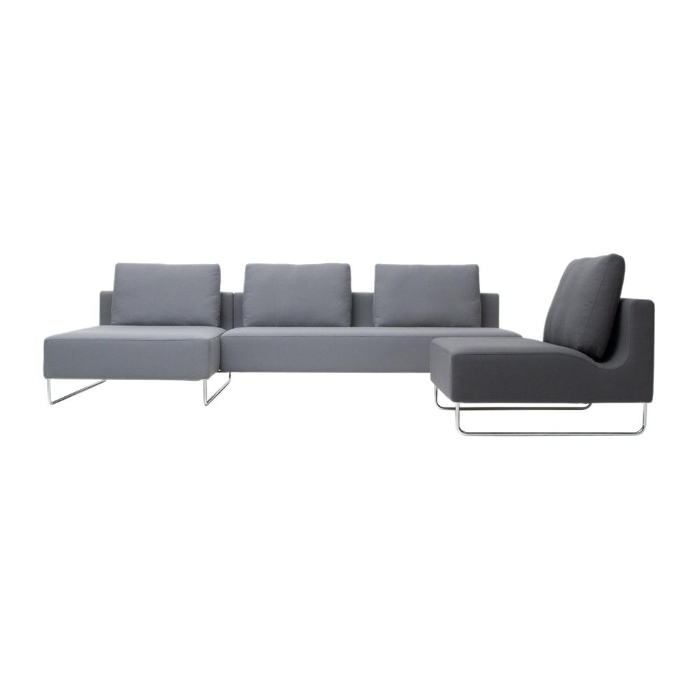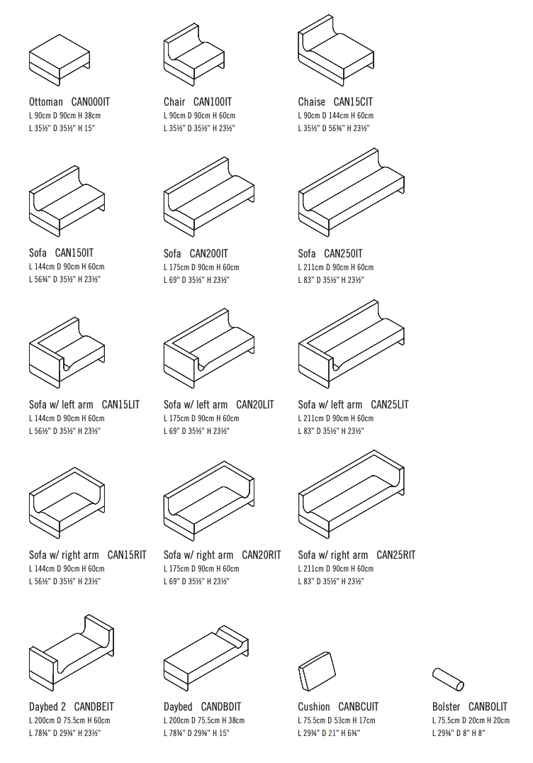 The Canyon family consist of various sizes of single-arm and armless pieces that can be combined to make an almost infinite number of configurations. Steel under-frames are made with novel construction techniques and allow one piece to be suspended on the other for a cleaner appearance. Covers are removable for easy cleaning or replacement.