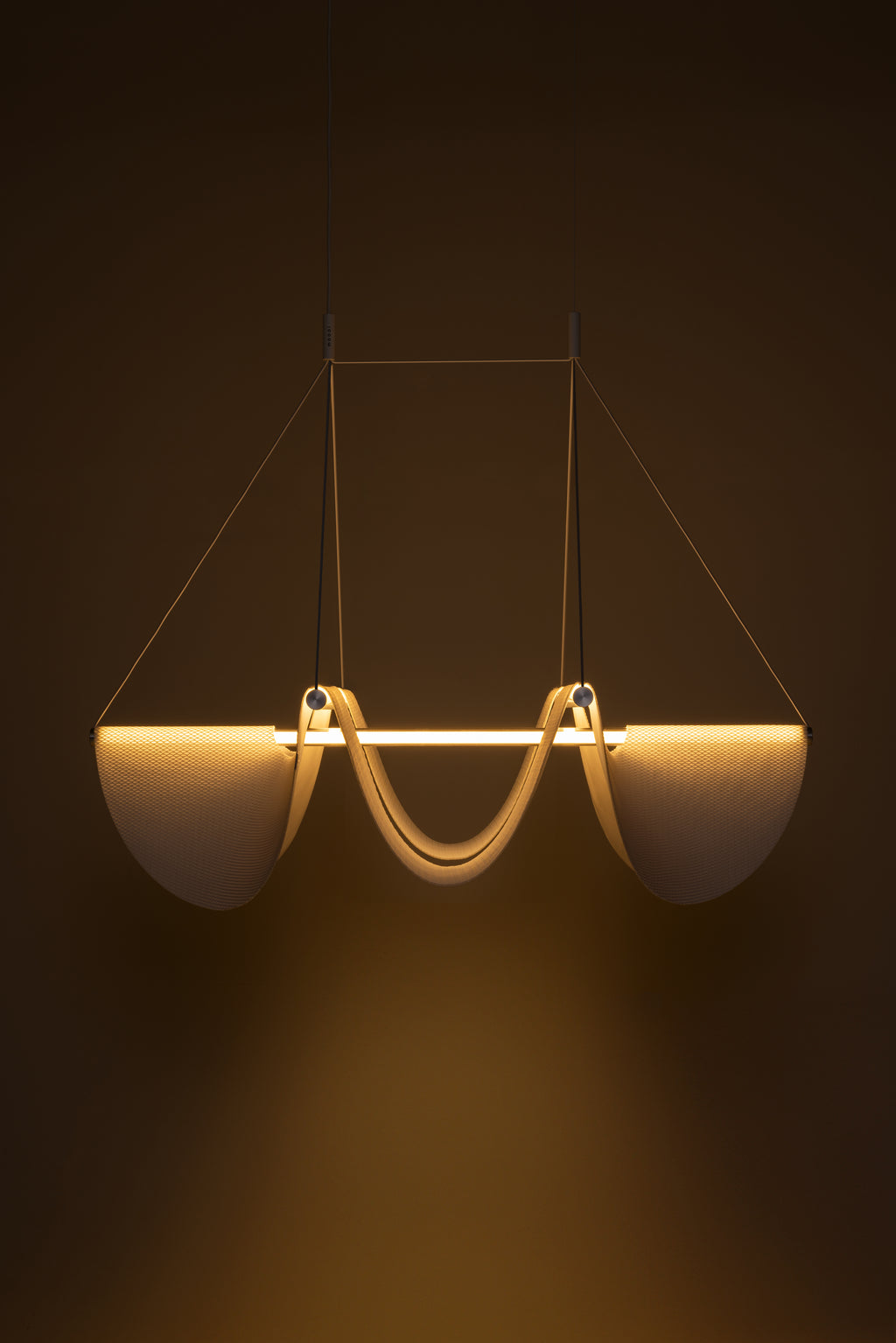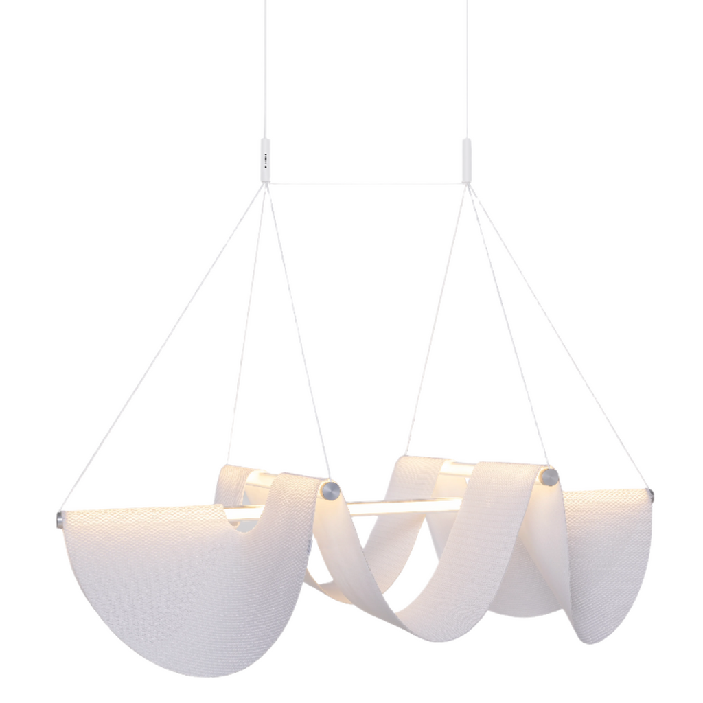 striking ephemeral and sculptural form. This innovative lighting transcends the ordinary, showcasing a harmonious relationship between its 3D-knitted polyester curvy shade and illuminated tubes.