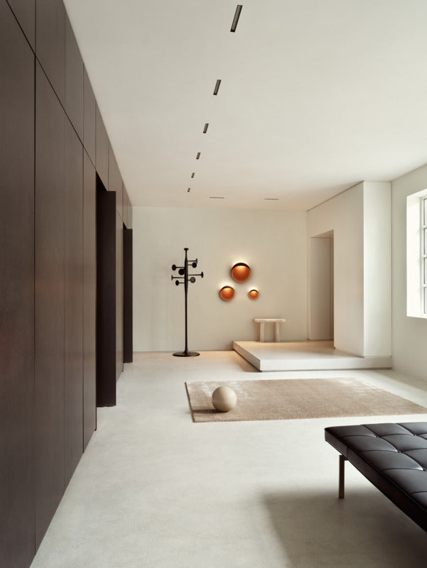 The new Flindt Wall fixture joins the popular Flindt Bollard to bring expressive illumination and bold, sculptural design to indoor and outdoor spaces alike. Based on the same carved-out design as its cylindrical bollard predecessor, the Flindt Wall continues the elegant form language in the shape of a perfect circle. The Flindt Wall is distinguished by a light egress from an opening in the top that emits light down the front of the fixture, creating a subtle, glowing ring of reflected light on the transition between the concave and convex shapes.