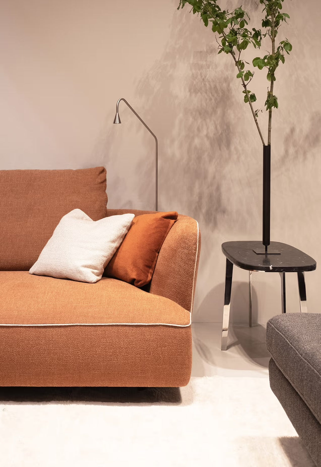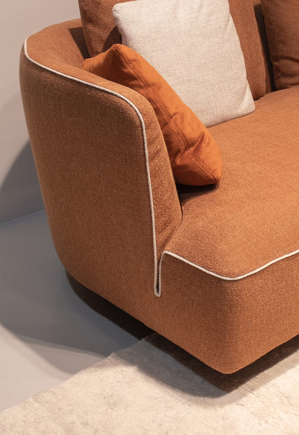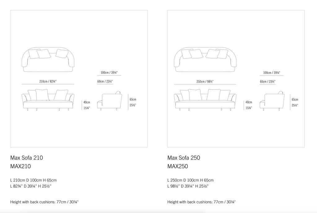 Grand proportions and refined tailoring define MAX; a sumptuous modular sofa allowing for a number of compositions, suitable for all types of living. Coil springs and layers of varying density foam over a wood frame offer great comfort, while the curved corners and down-feather cushions create a cozy nook perfect for relaxation. The sofa is available with piping or top-stitched seam.