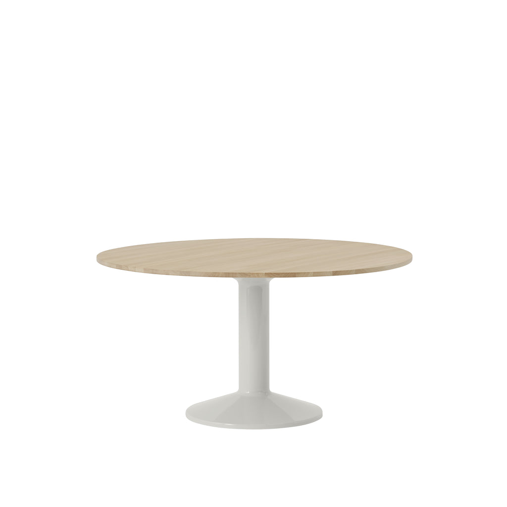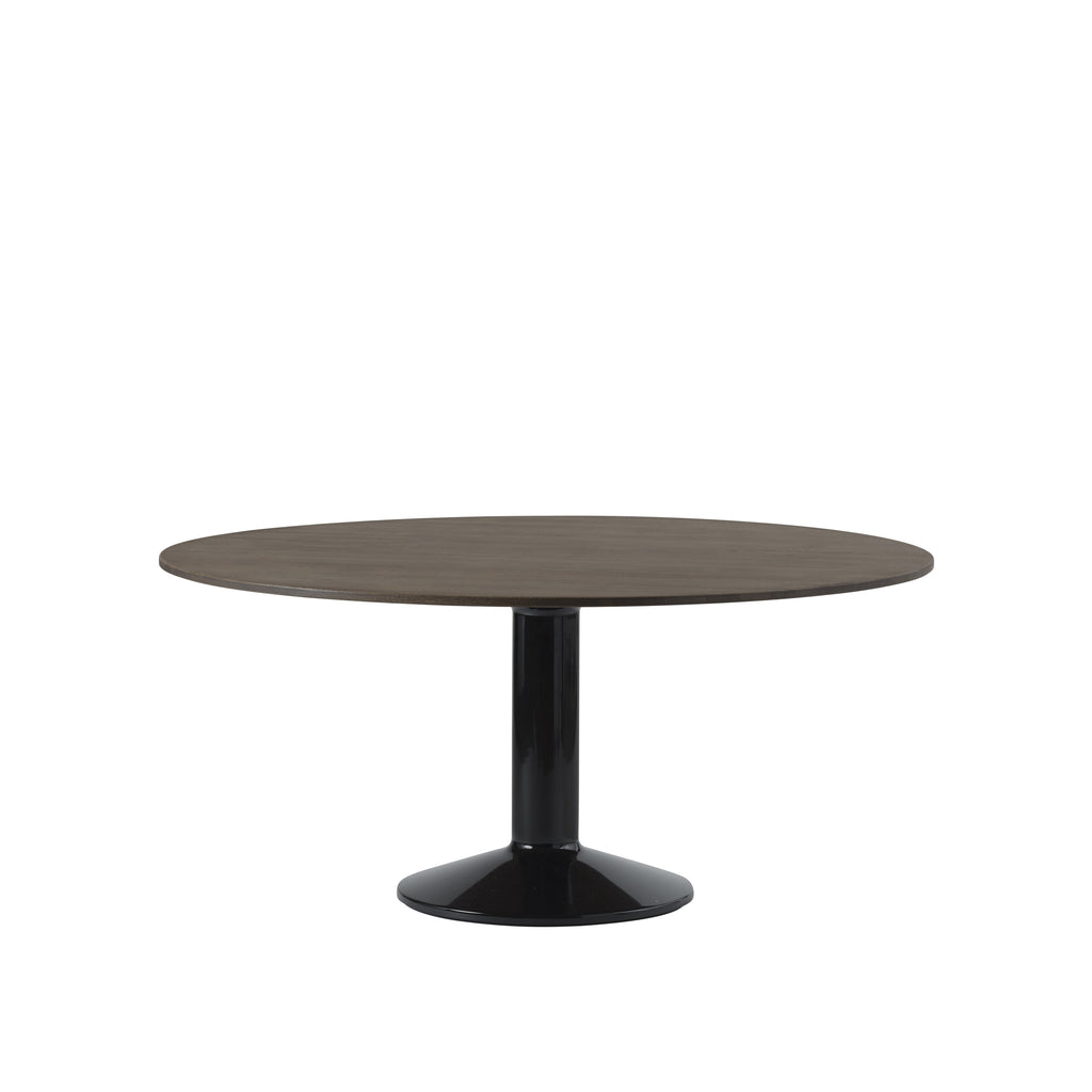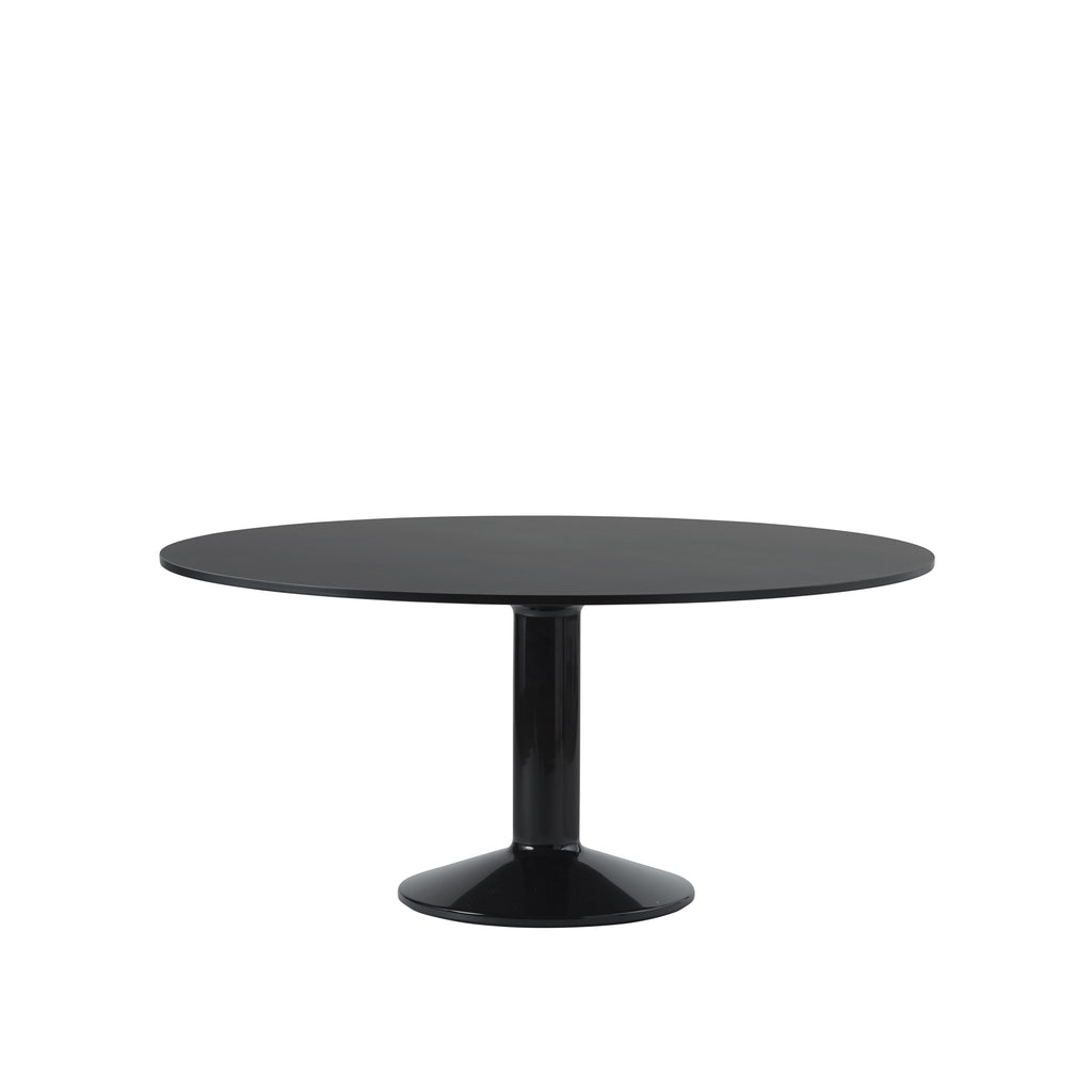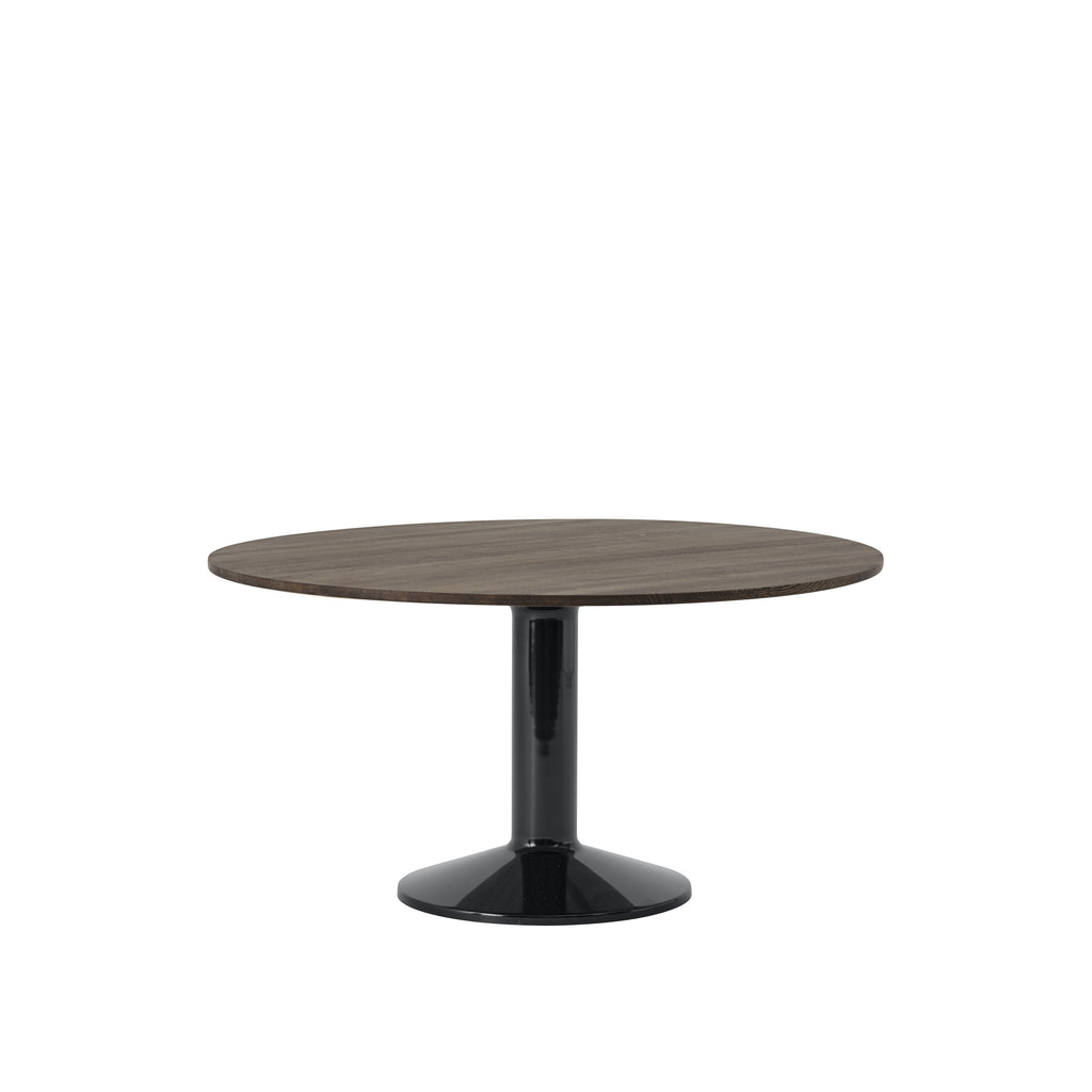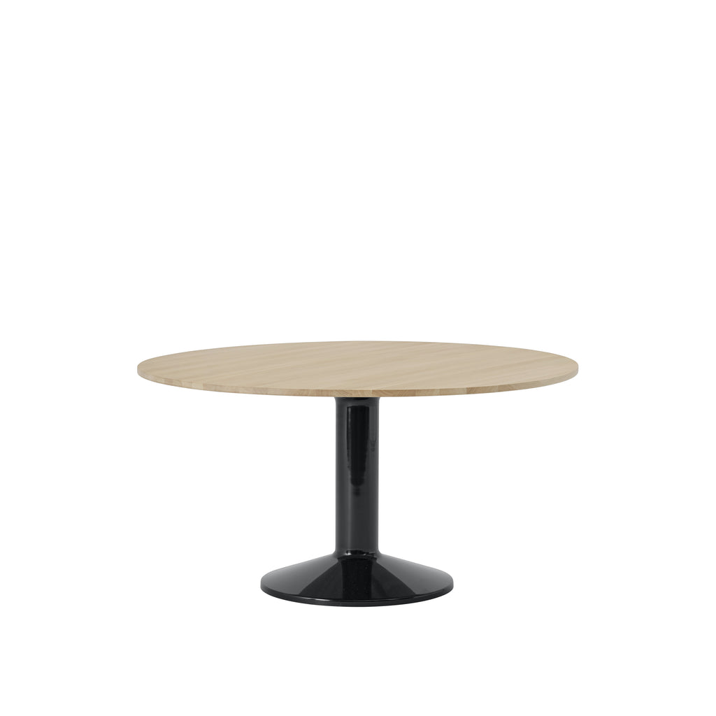 A natural focal point of the home, the Midst Table is a generous, round dining table where friends and family gather — and there is always room to squeeze in one more guest. Its refined silhouette is simple yet characteristic, enhanced by distinct detailing and contrasting materiality; matte solid oak or linoleum on a monolithic base made of spun steel with a durable high gloss finish.
