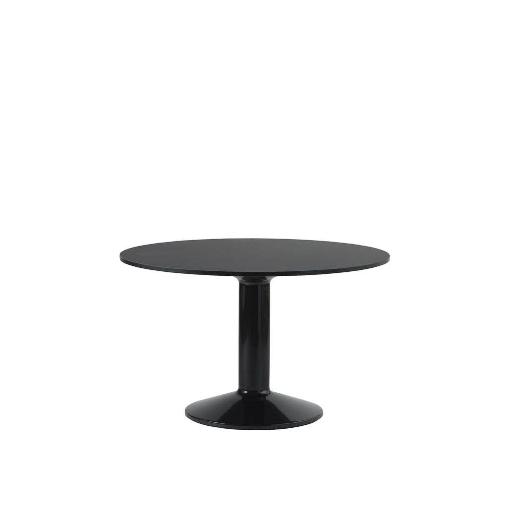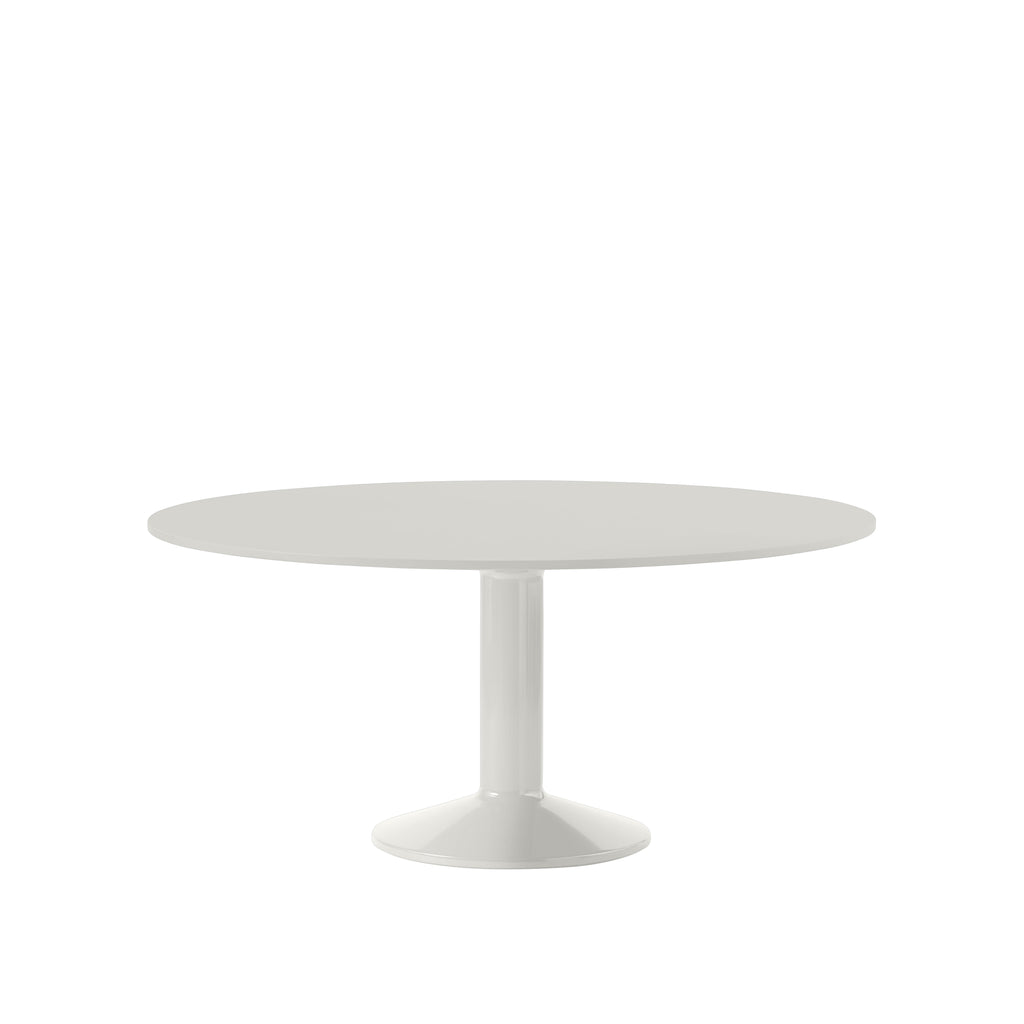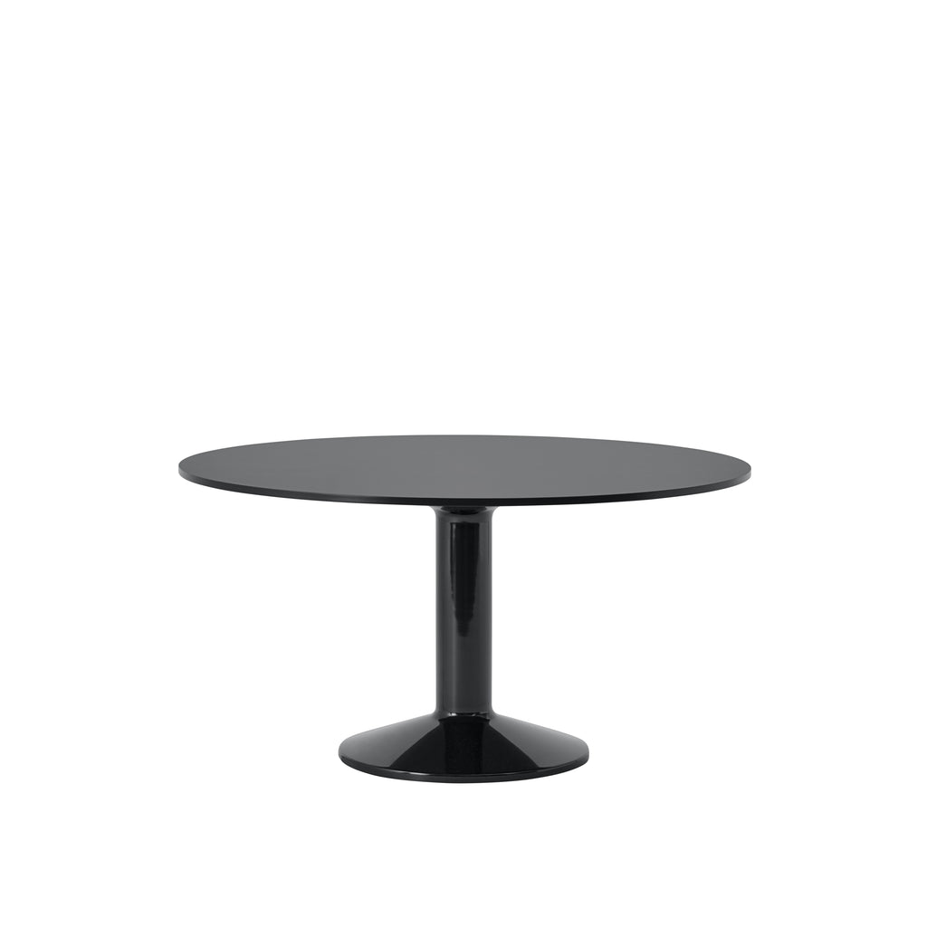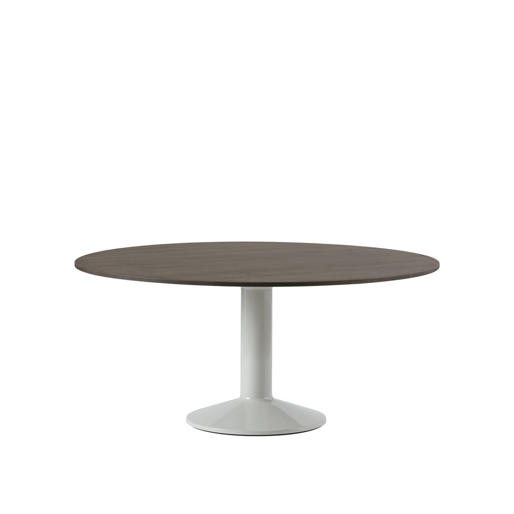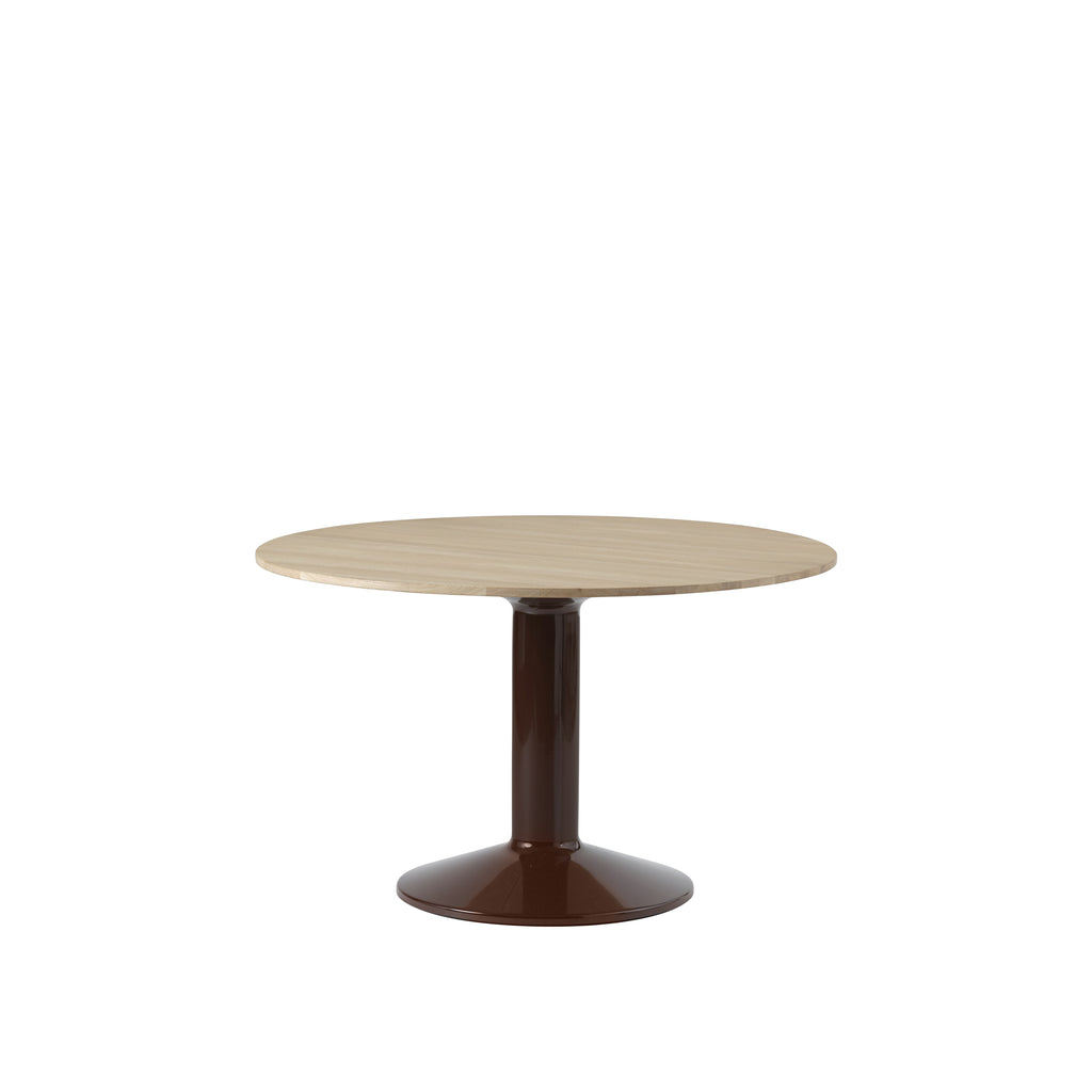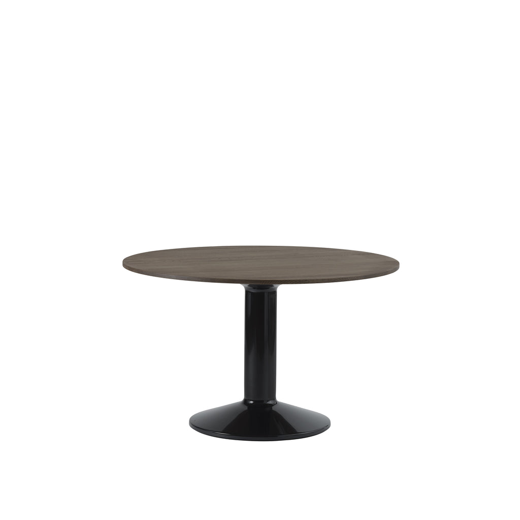 A natural focal point of the home, the Midst Table is a generous, round dining table where friends and family gather — and there is always room to squeeze in one more guest. Its refined silhouette is simple yet characteristic, enhanced by distinct detailing and contrasting materiality; matte solid oak or linoleum on a monolithic base made of spun steel with a durable high gloss finish.