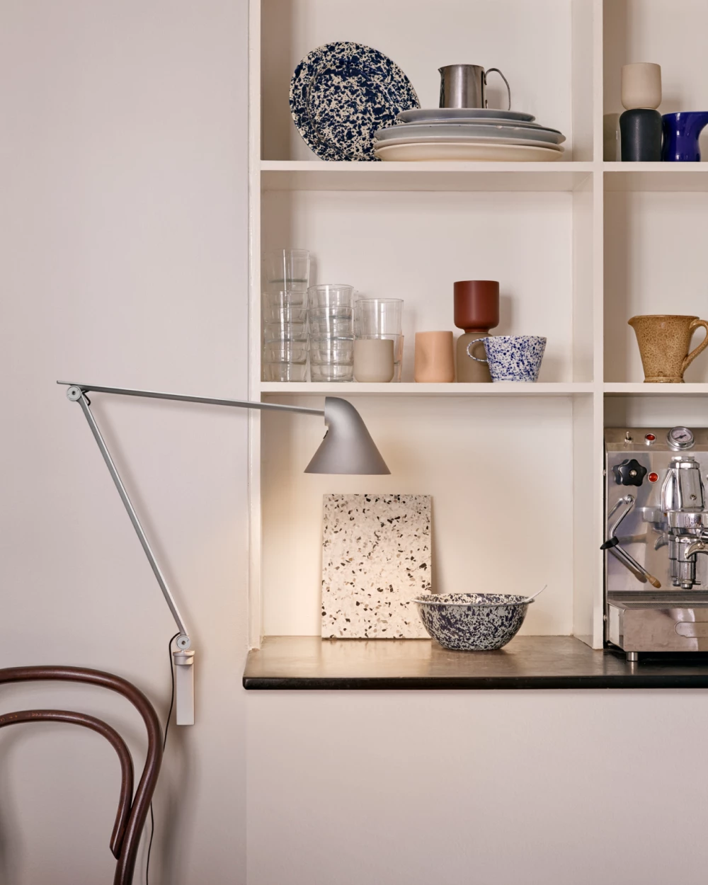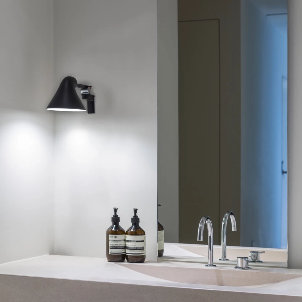 The NJP series was designed by Oki Sato, founder of nendo design studio, with the intention of producing a new interpretation of the classic anglepoise lamp – with all its familiar details – in a contemporary design, featuring functions adapted to modern working life, both in the office and at home. The NJP Wall lamp’s flexible head and arms provide exceptional adjustability, which is often lacking in standard wall lights. This makes the light highly suitable for the bedroom, where adjustable beds are becoming increasingly common, and where it can be difficult to find the ideal position for a fixed wall light. It features an LED light source and is designed with the source positioned high up as to avoid dazzling and unpleasant lighting. One refined yet practical detail is its chimney-shaped head reflecting some of the light through the rear and therefore illuminating the top of the arm – while allowing the heat from the light source to escape.