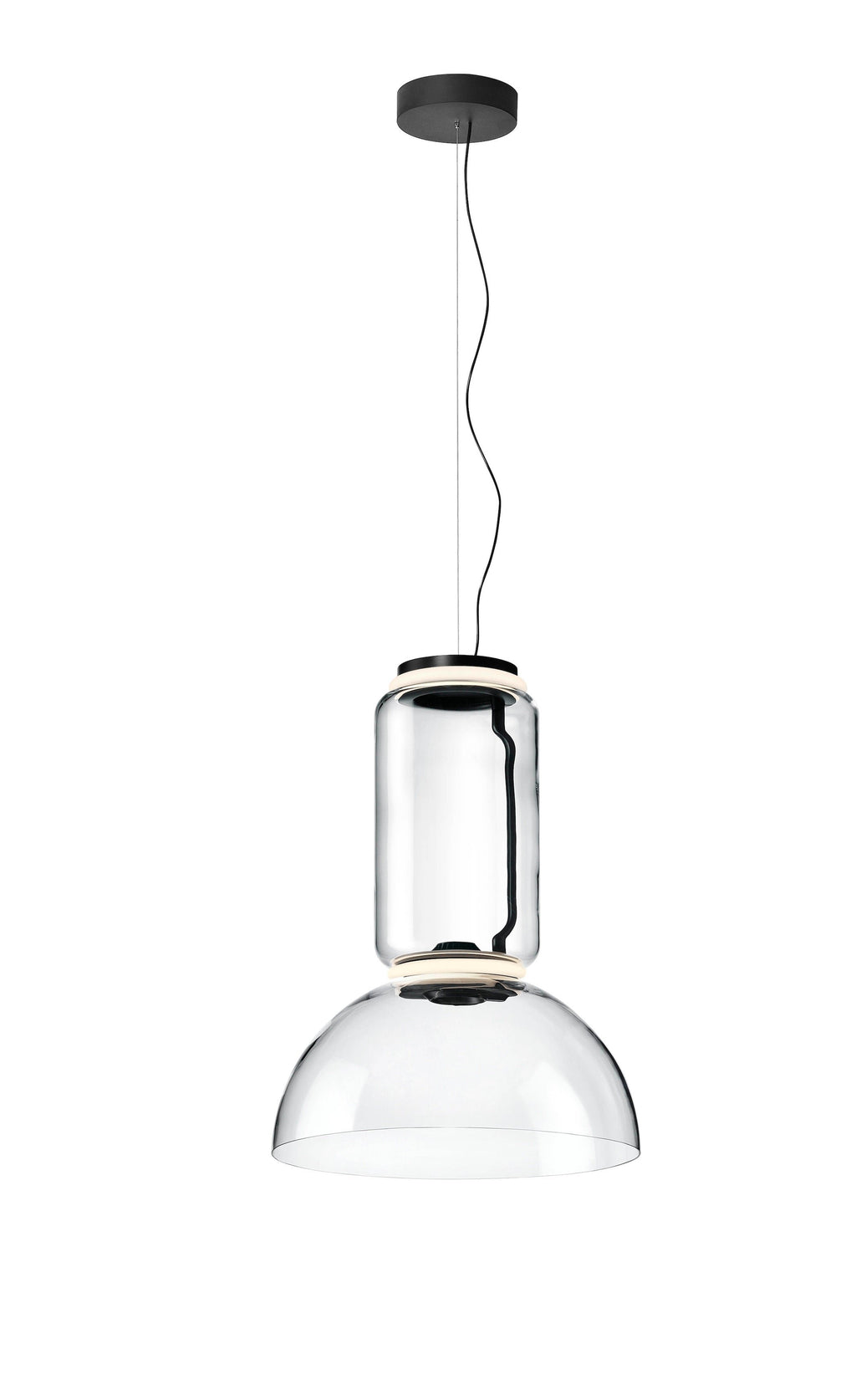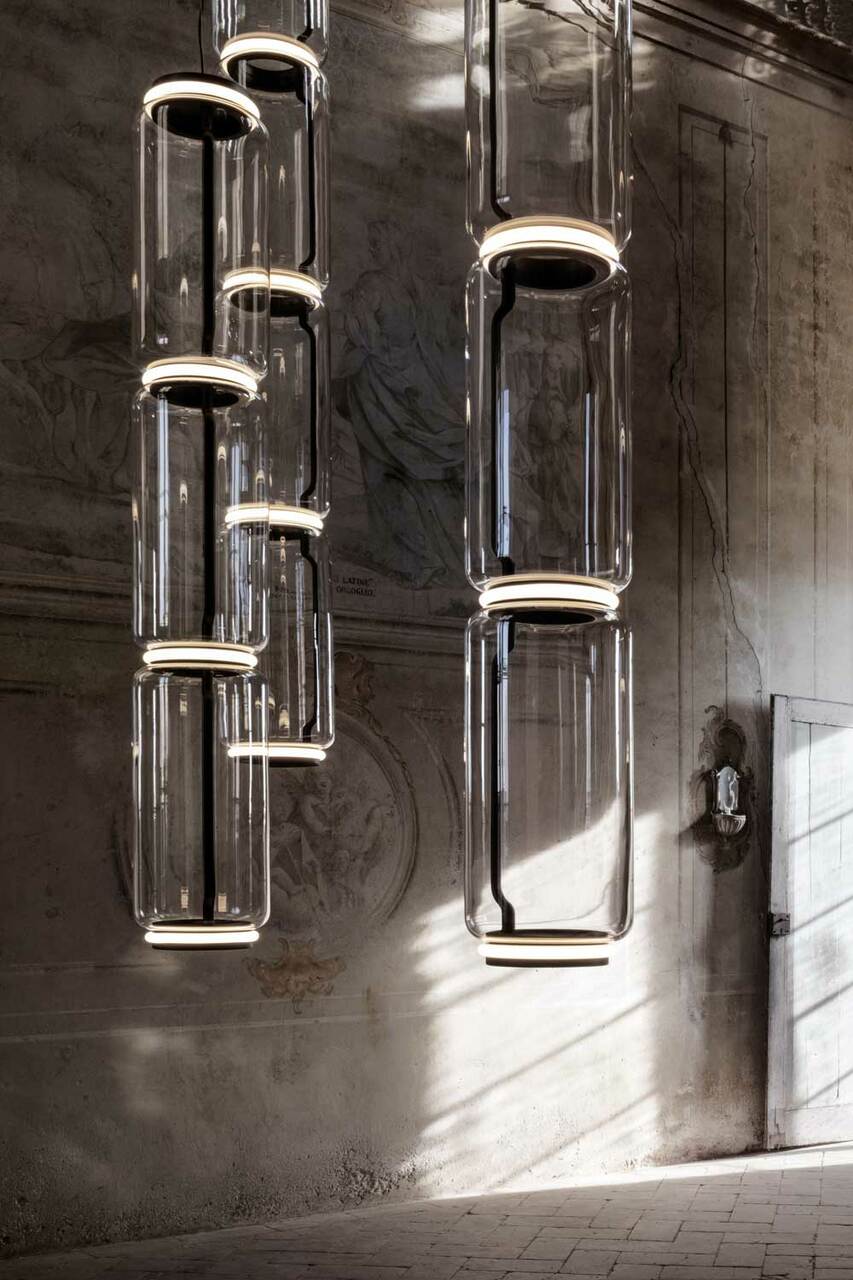The lamp’s cylindrical body and dynamic heads can be used to create a direct light source. Powered by LED technology, the lighting fixture’s foundation is a transparent cylinder (made using hand-blown glass). Grcic has modeled the lamp to be dynamic in nature – it can be used as a hanging light or standing lamp – and features additional components that allow the user to experiment with the product in unprecedented ways.