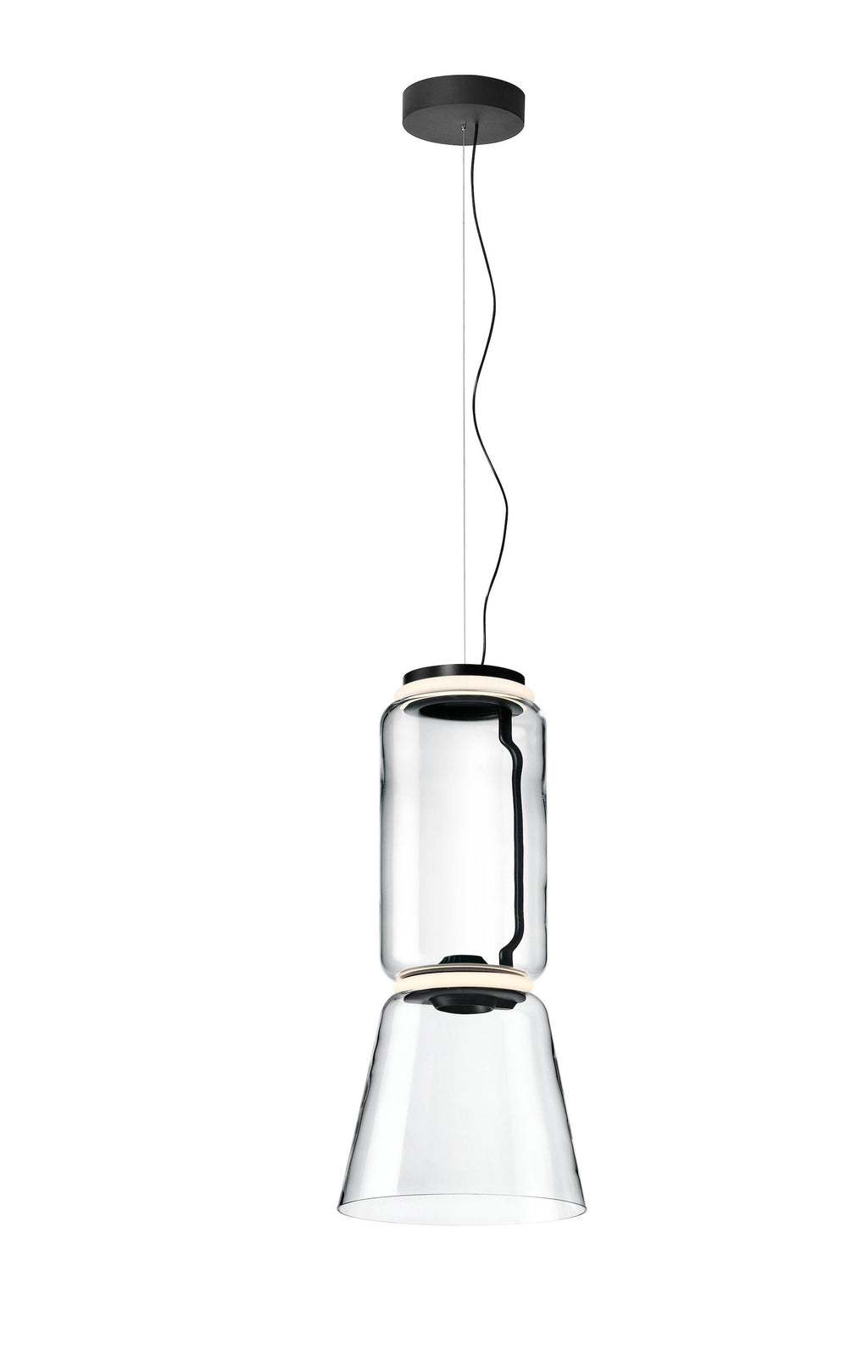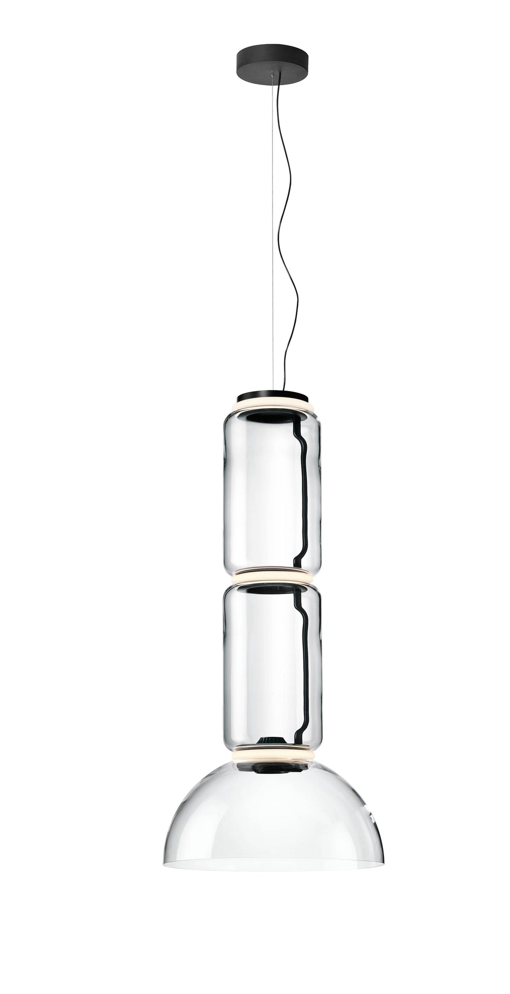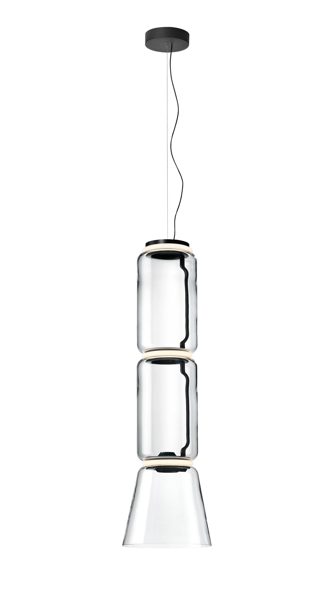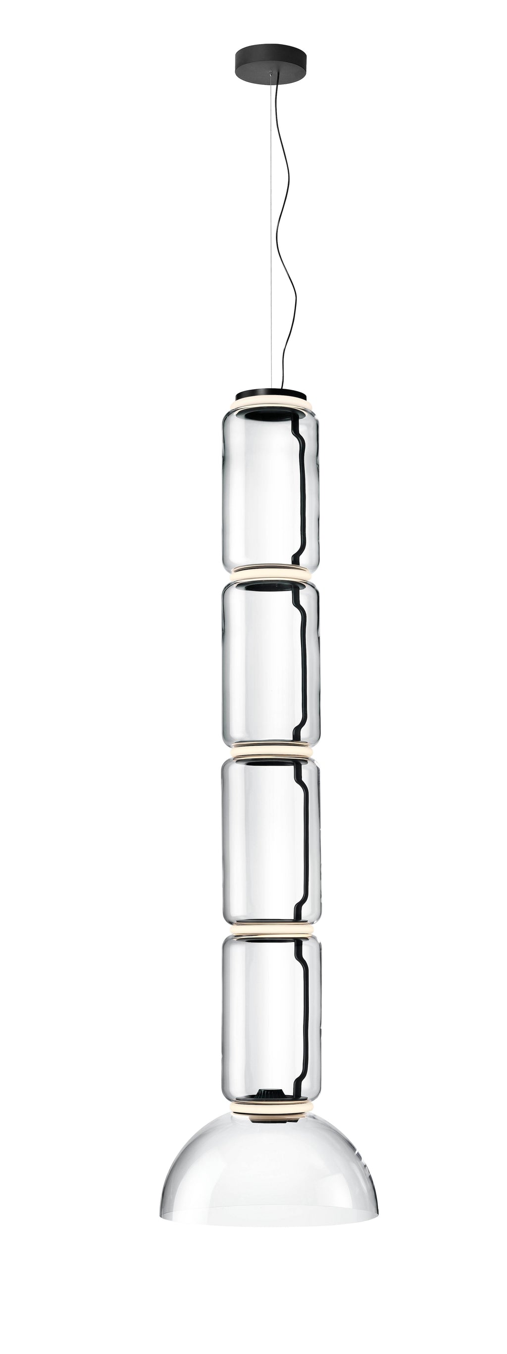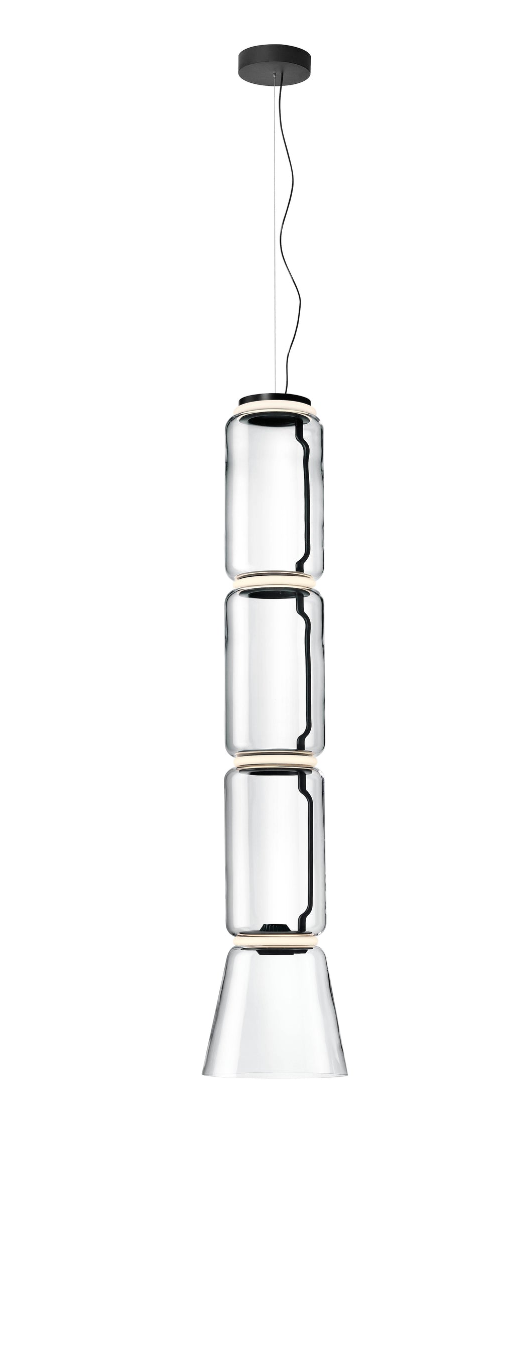 Noctambule LED dimmable pendant light short cylinders by FLOS is the latest in the series of inventive lighting fixtures envisioned and executed by master designer Konstantin Grcic. This groundbreaking lighting system is made up of various units that blend together to provide illumination at the intersection between every module. Offered in a variety of artistic designs, Noctambule’s dimmer can be operated from its power unit within the ceiling rose, or controlled using the pedal-enabled panel in its power cord.