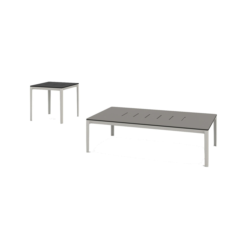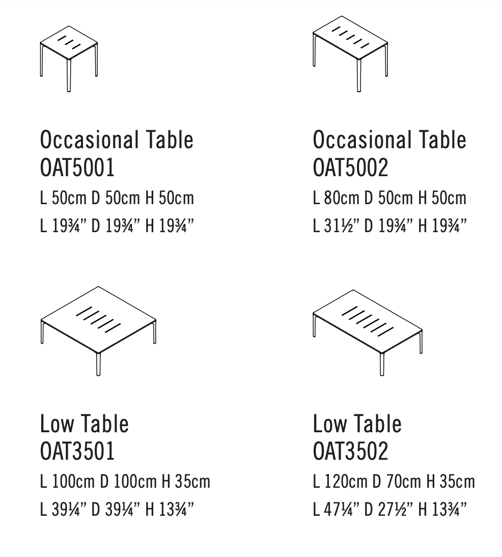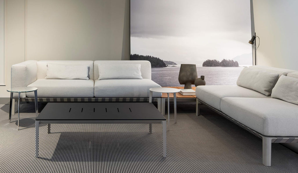 Following the table perimeter a thin beveled edge adds visual lightness, while the tapered cast aluminum legs denote strength and rigidity. Configured as a dining or coffee table the spacing of the wood slats create small gaps that allow for water drainage. A similar detail is repeated in the occasional and low tables whereas diminutive linear slits perforate the Polaris surface.