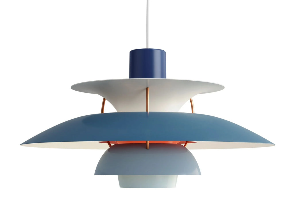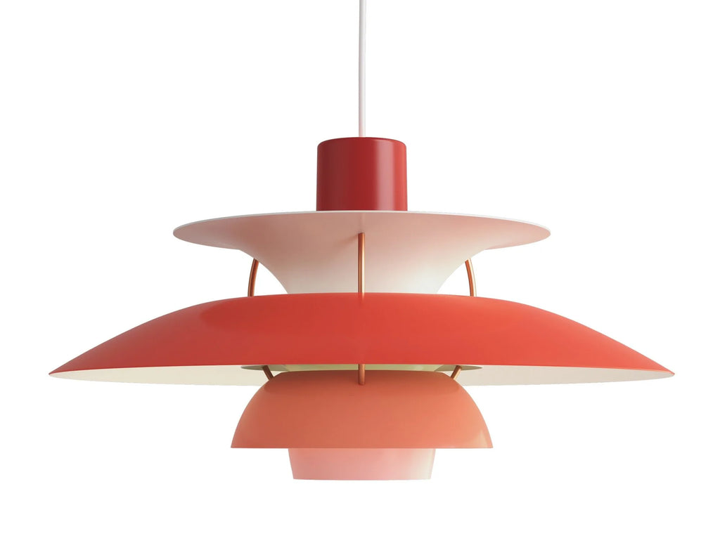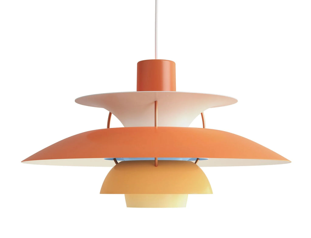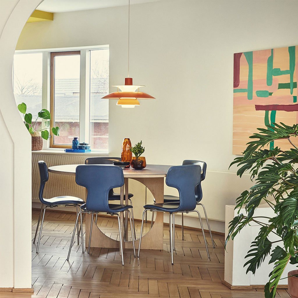 The fixture provides a comfortable, glare-free light based on the principle of Poul Henningsen’s reflective three-shade system, which directs the majority of the light downward. It emits a lateral light as well as illuminating itself, providing a soft radiance from within its core. The lower shade is fitted with a frosted-glass diffuser to ensure that the downwardly directed light is 100% glare-free.