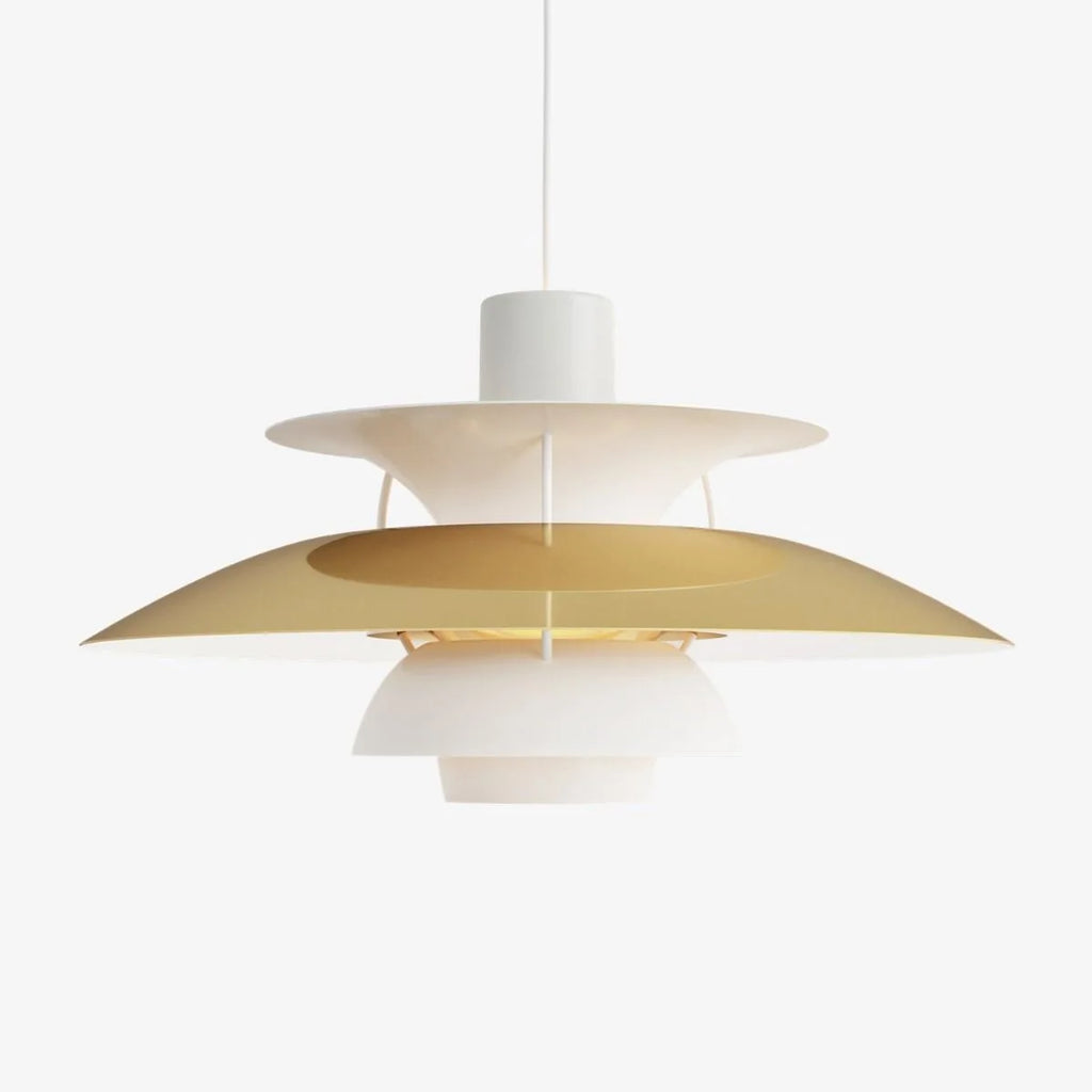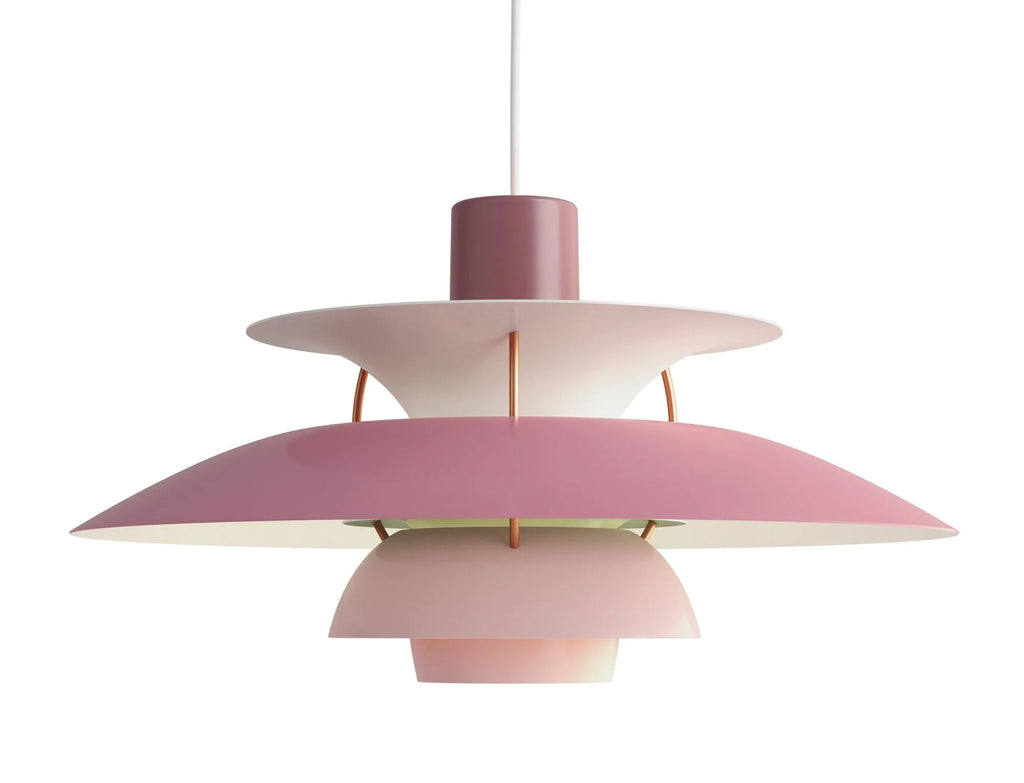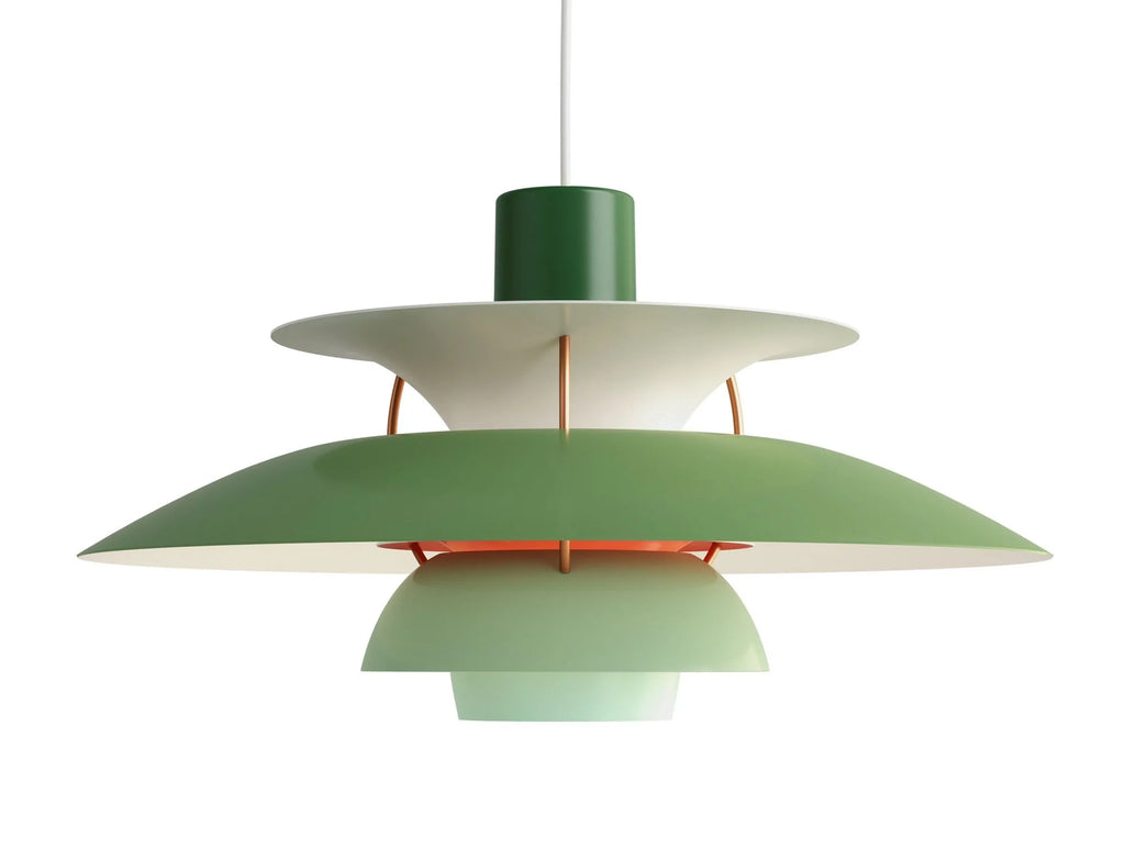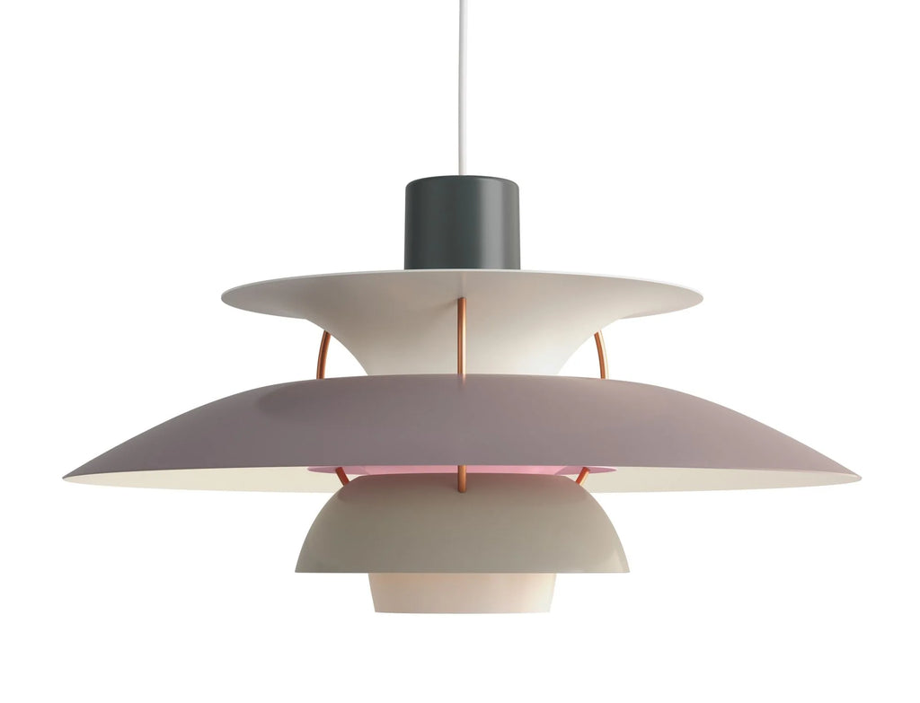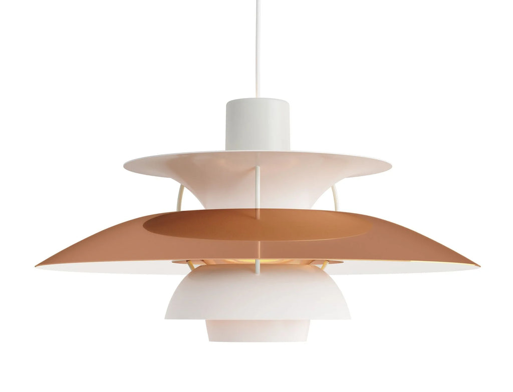 The fixture provides a comfortable, glare-free light based on the principle of Poul Henningsen’s reflective three-shade system, which directs the majority of the light downward. It emits a lateral light as well as illuminating itself, providing a soft radiance from within its core. The lower shade is fitted with a frosted-glass diffuser to ensure that the downwardly directed light is 100% glare-free.