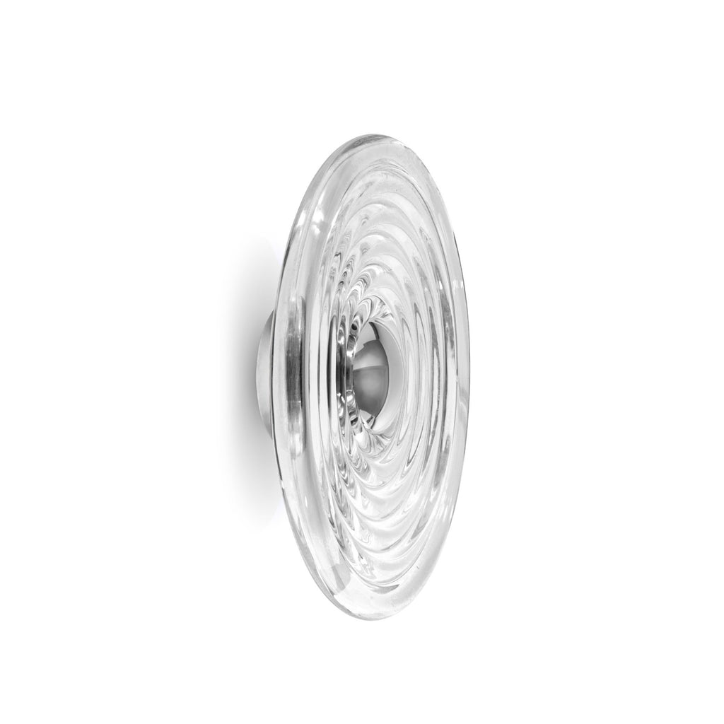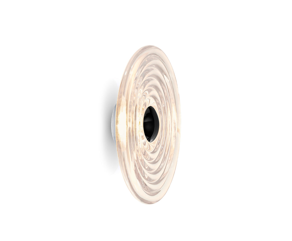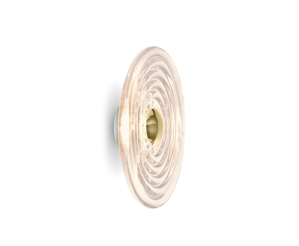 A stunning contemporary wall light made of the thickest industrially pressed glass. Designed and engineered to catch and refract light, and to last for ever. The ribbed glass creates diffusion of the light source and projects linear and stripy patterns. The metal dome on the surface lights has been upgraded from a flat cap to a curved dome, for a cleaner aesthetic.