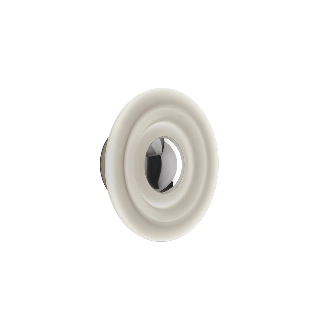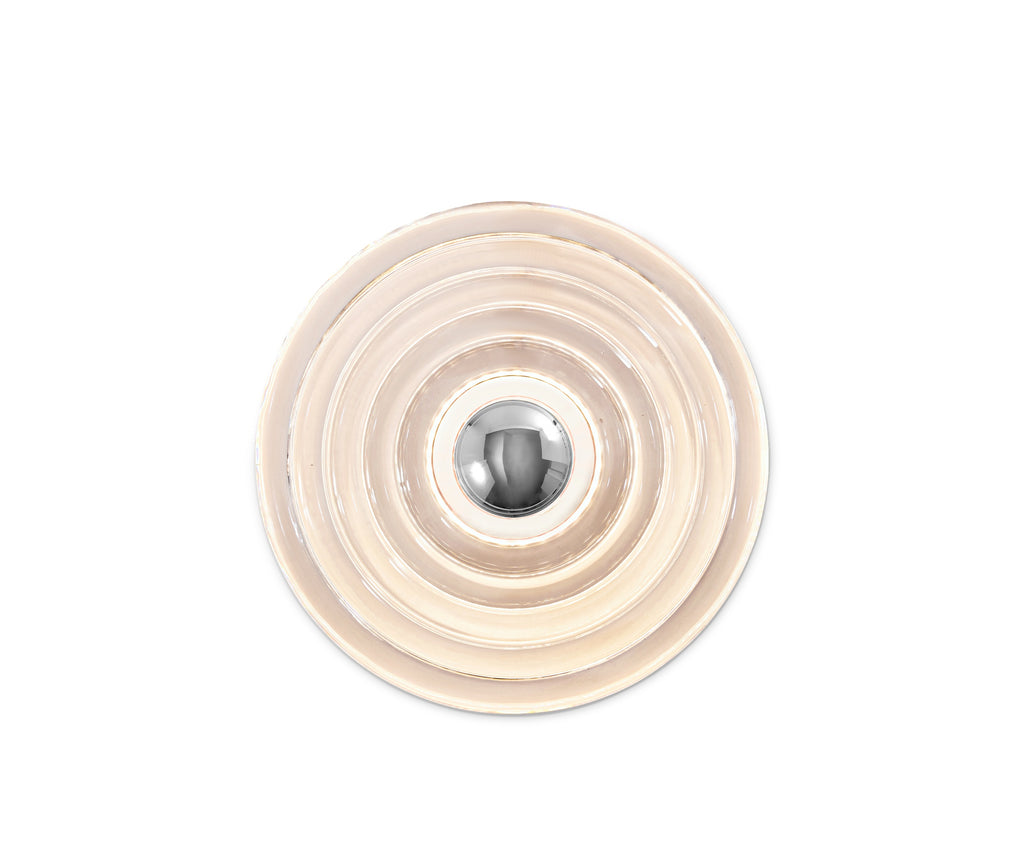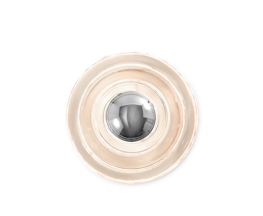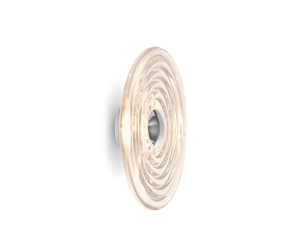 A stunning contemporary wall light made of the thickest industrially pressed glass. Designed and engineered to catch and refract light, and to last for ever. The ribbed glass creates diffusion of the light source and projects linear and stripy patterns. The metal dome on the surface lights has been upgraded from a flat cap to a curved dome, for a cleaner aesthetic.