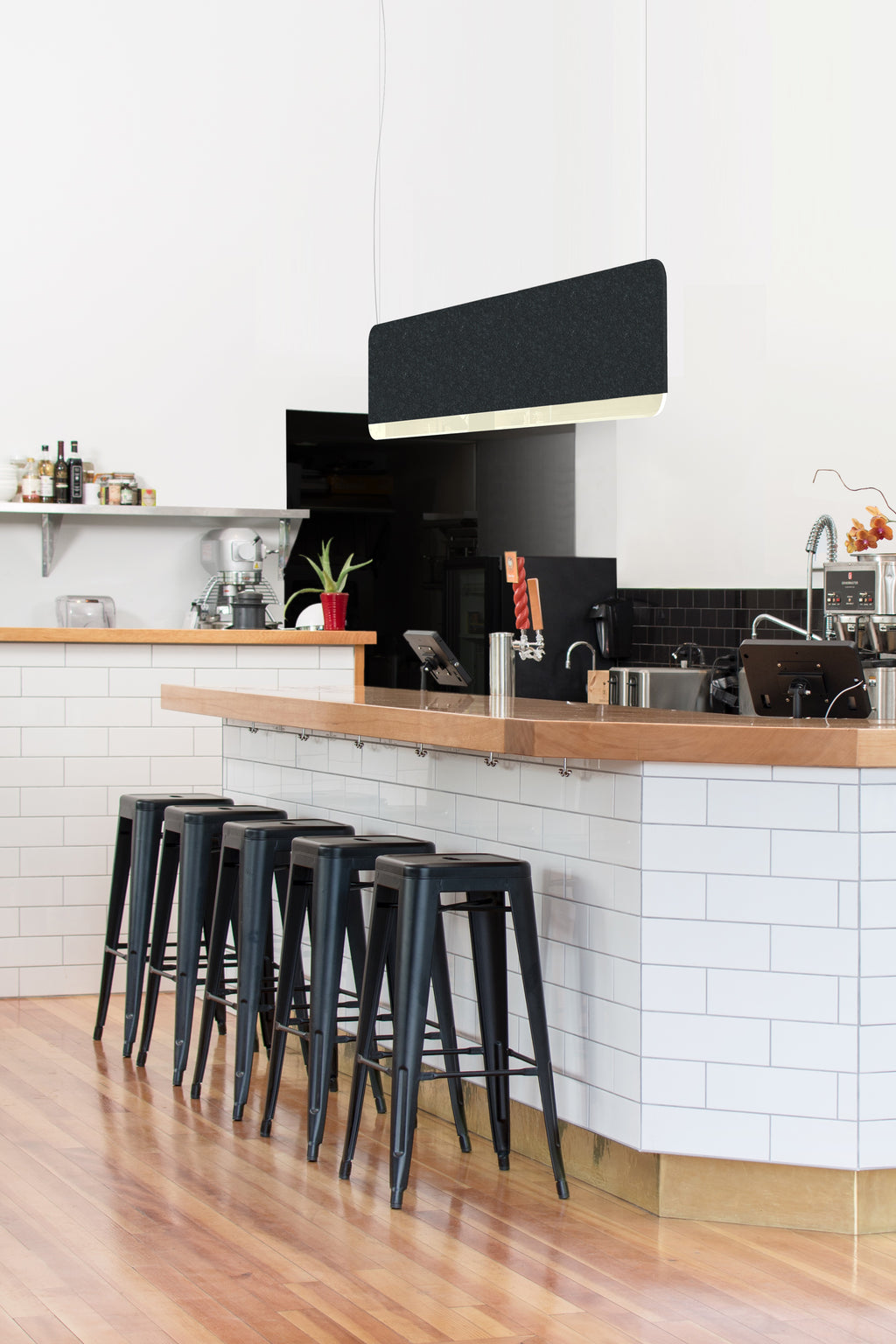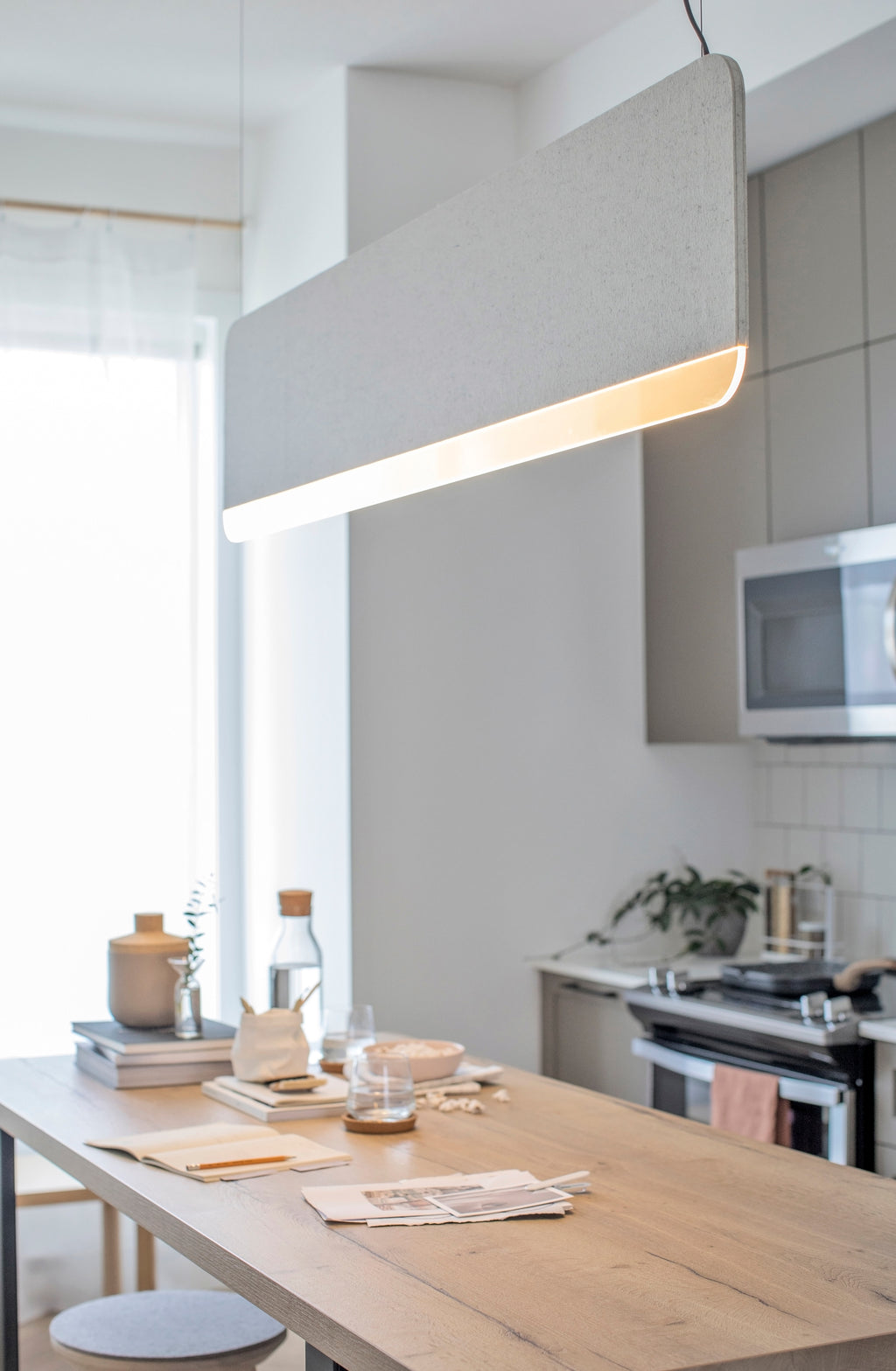 The Slab 150 pendant light combines a visually graphic presence, impossibly slim profile and acoustic dampening properties to provide an aesthetically unique and diverse light fixture which is effortlessly useful in a myriad of applications; corporate office; crowded restaurant; dining room table, and much more.