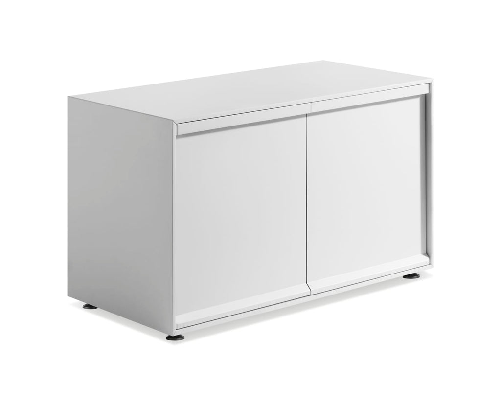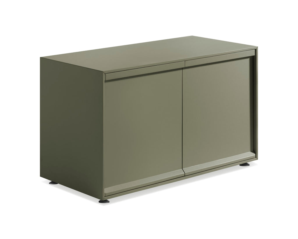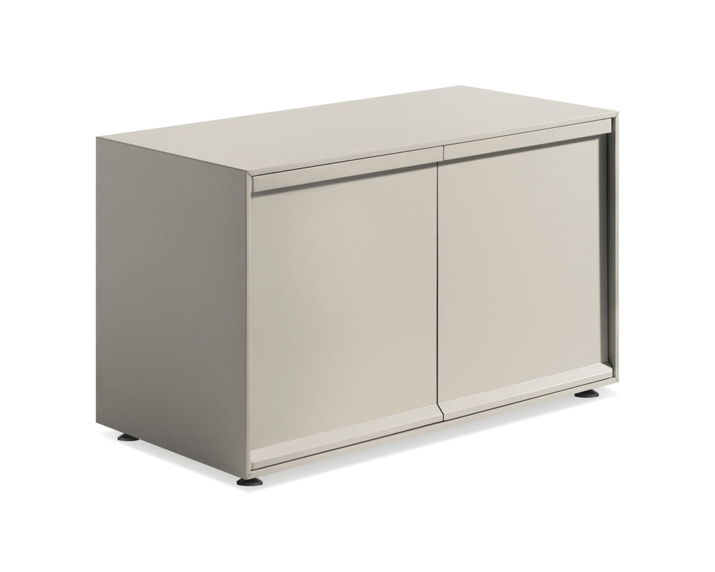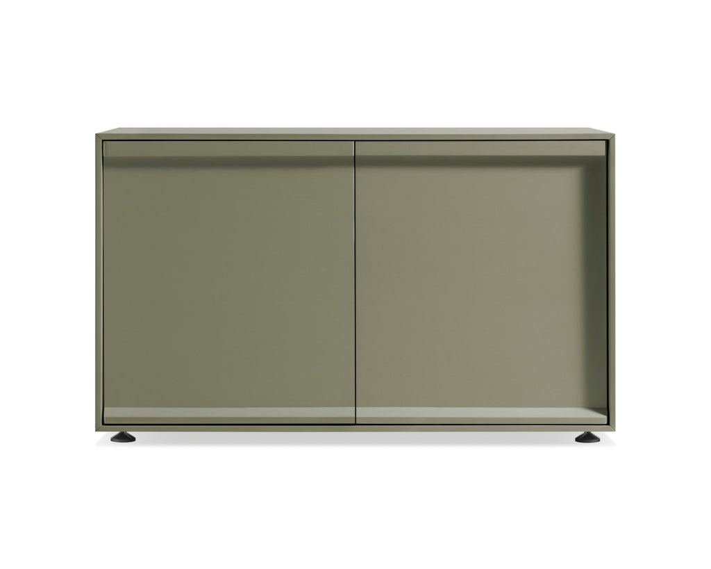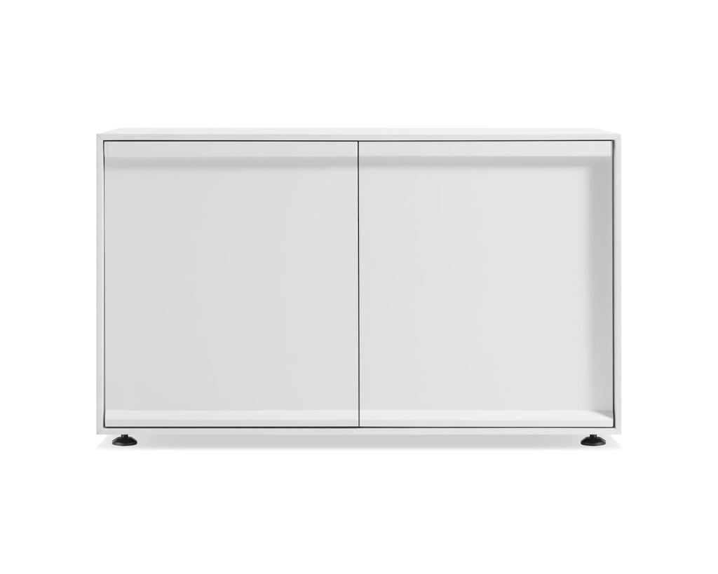 Tranquil staple. Crisp lines and unassuming relief pulls conspire to keep the action behind soft close doors. A matte painted finish in muted tones delivers serenity and sets up a streamlined storage solution for the living room, bedroom and office.
