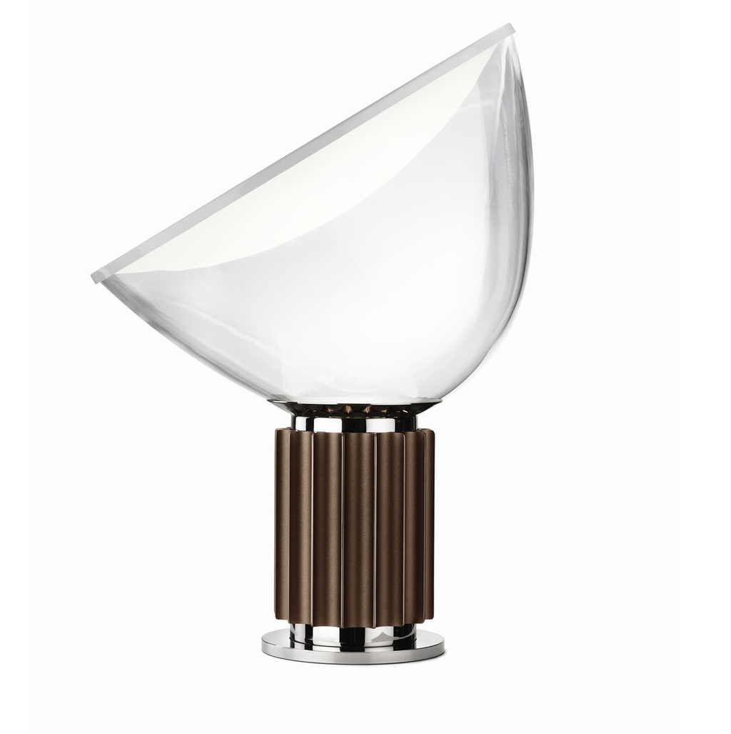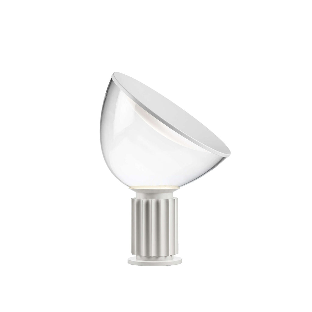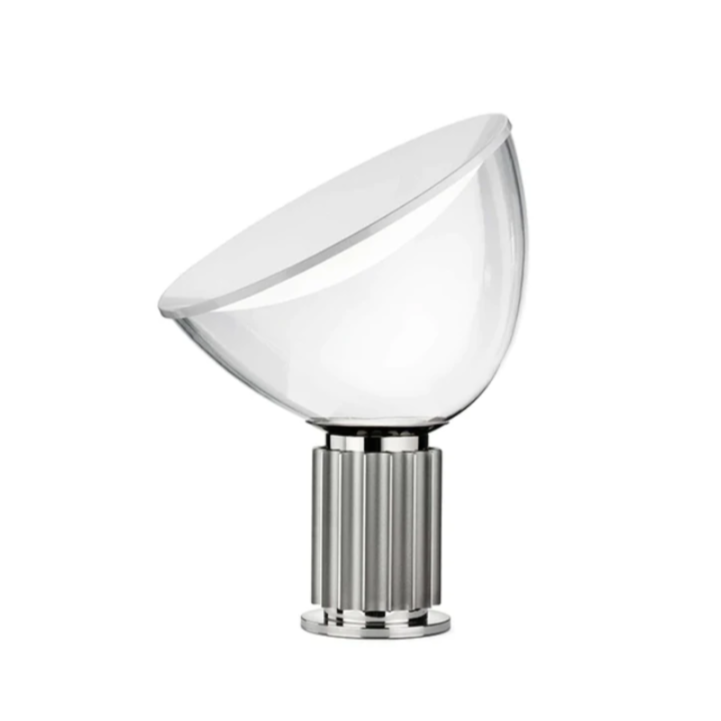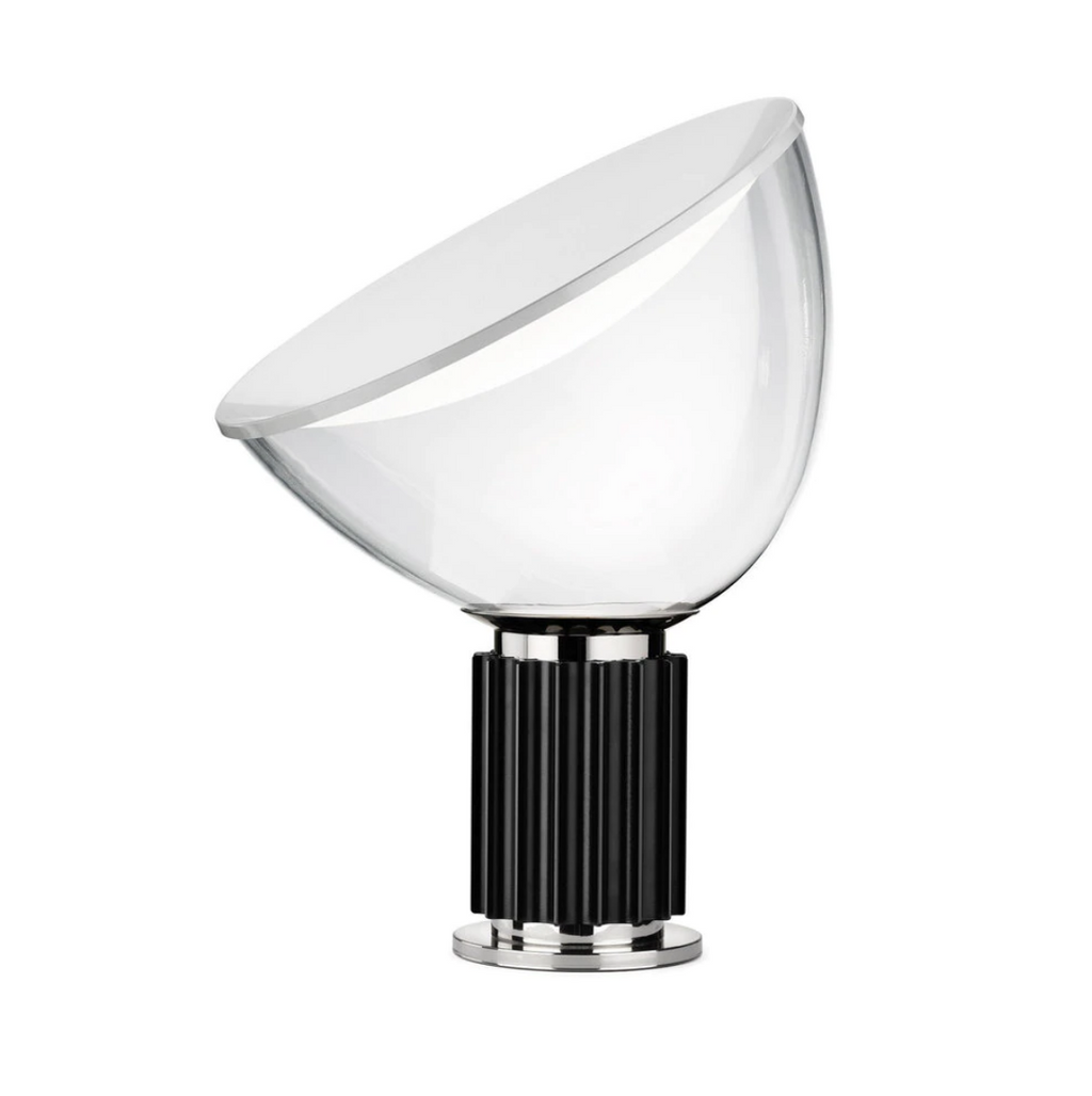 Table lamp providing indirect and reflected light. Reflector in painted aluminium, gloss white on the inside and matt white on the outside. Direction-able diffuser in transparent blown glass. Body in matt black or naturally anodized extruded aluminium. Base in nickel-plated ABS+PC. Electric cable of useful length 190 cm, with dimmer switch for ON/OFF and adjustment of the light flow between 10-100%. Plug-in power supply with interchangeable plugs.